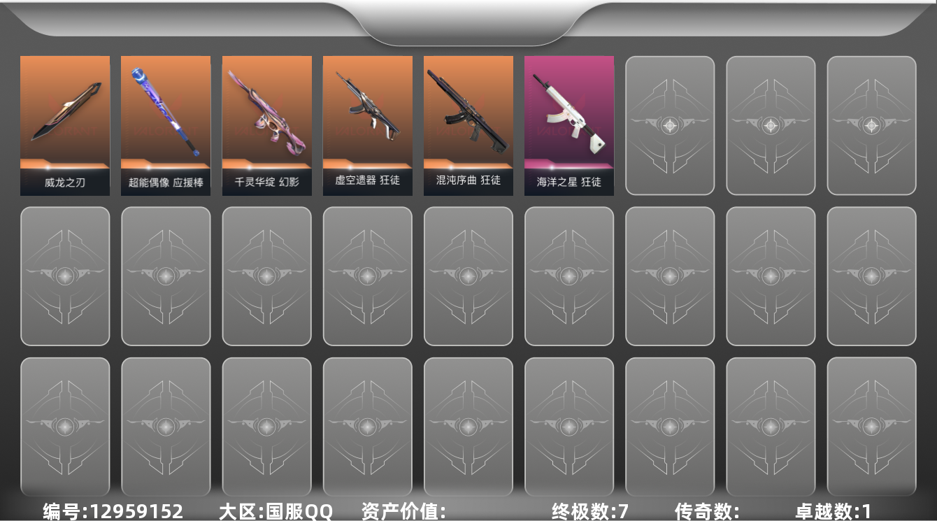 - [11497662]V7 1典藏 6传说 123英雄 186皮肤 可修改实名 荣耀水晶:全息碎影(猴子典藏) 传说皮:幻光神枪,零号·赤焰,地狱之眼 珍宝阁皮:优雅恋人,女武神 限定皮:愿照·千秋盛(女娲年限),鸣野蒿,凤求凰(白切鸡),遇见飞天,五谷丰年,梁祝,李小龙,默契交锋-花木兰 史诗皮:星界战将,器灵·浮梦炉,上官婉儿群星魔术团,紫霞仙子,黄金分割率,特工魅影,千年之狐,江河有灵,蒙恬荣光圣徽,偶像歌手,无限星赏官,电玩·爆裂旋风,龙骑士(小龙虾),猫狗日记-孙策,乱世虎臣,节奏热浪,女仆咖啡,水果甜心,天才门将,星夜王子,功夫厨神,德古拉伯爵,暗隐猎兽者,幽灵船长,鬼剑武藏,舞动绿茵,地狱岩魂,纤云弄巧,缤纷独角兽,乘风破浪,逐浪之夏,水晶猎龙者,曙光守护者,箭羽风息,金属风暴,原初追逐者,圣诞狂欢,圣诞恋歌,鹰眼统帅,魅力维加斯