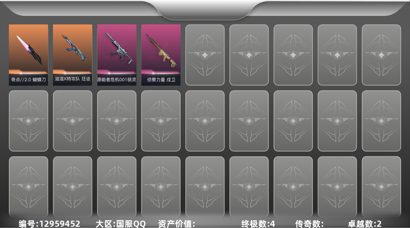 [12959452]【套装】:2025全球冠军赛套装 【英雄】:炼狱,壹决,铁臂,捷风,幽影,不死鸟,贤者,猎枭,芮娜,钢锁 【近战 武器】:近战武器-2025全球冠军赛 蝴蝶刀,近战武器-奇点//2.0 蝴蝶刀 【狂徒】:狂徒-2025全球冠军赛,狂徒-滋滋X特攻队 【戍卫】:戍卫-侦察力量 【战神】:战神-极简主义 【骇灵】:骇灵-源能者危机001 【卡面】:南瓜盛典 卡面,梦幻奶茶 卡面,代号红色 卡面,新兵报到 卡面,V契约 卡面,无畏契约 卡面 【喷漆】:胜利属于无畏契约 喷漆,GLHF 喷漆,无畏契约 喷漆 【挂饰】:第九季//第三幕 纪念币 挂饰,无畏契约 纪念币 挂饰