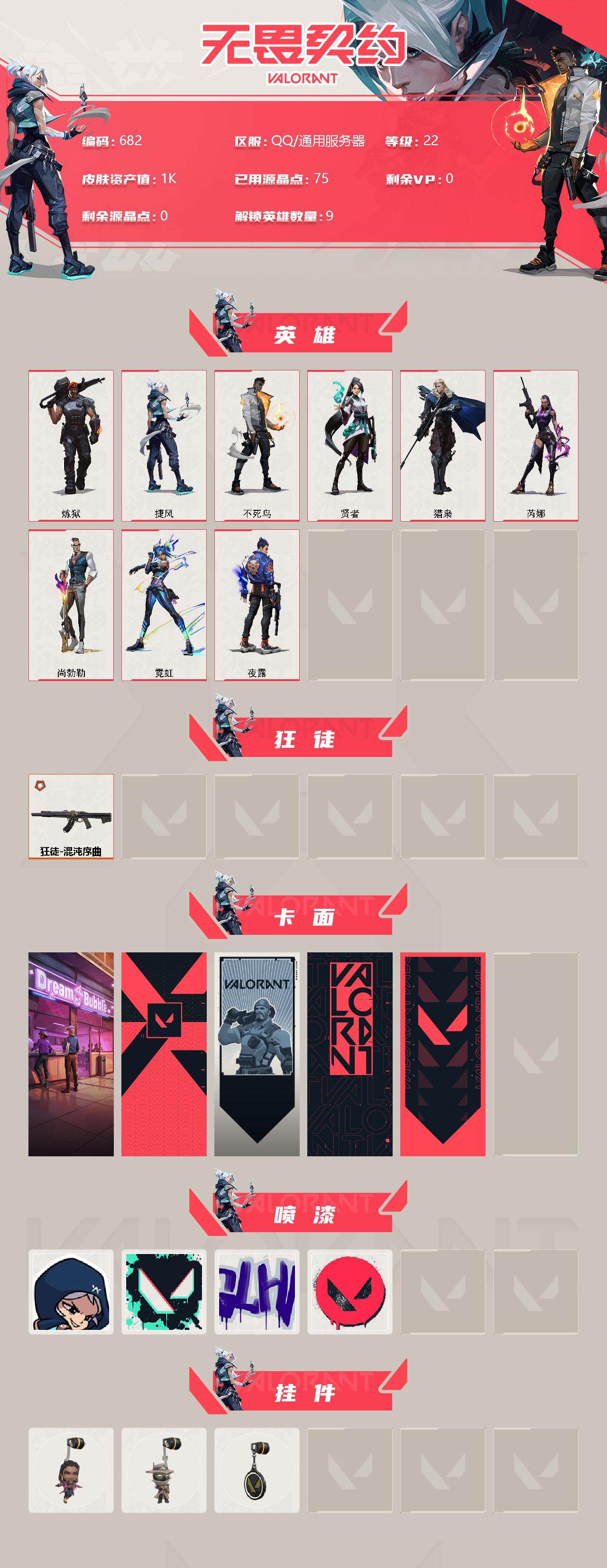 [12959532]【英雄】:炼狱,捷风,不死鸟,贤者,猎枭,芮娜,尚勃勒,霓虹,夜露 【狂徒】:狂徒-混沌序曲 【卡面】:梦幻奶茶 卡面,代号红色 卡面,新兵报到 卡面,V契约 卡面,无畏契约 卡面 【喷漆】:捷风差距 喷漆,胜利属于无畏契约 喷漆,GLHF 喷漆,无畏契约 喷漆 【挂饰】:无畏契约GO!第一卷 芮娜 挂饰,无畏契约GO!第一卷 零 挂饰,无畏契约 纪念币 挂饰