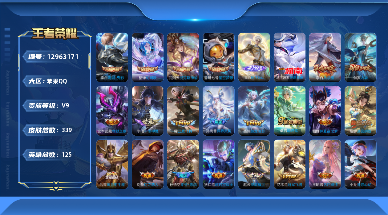 [12963171]苹果Q-V9-至尊星耀III段位-125英雄-339皮肤-4典藏-0珍品无双-1无双-1珍品传说-20传说-91史诗