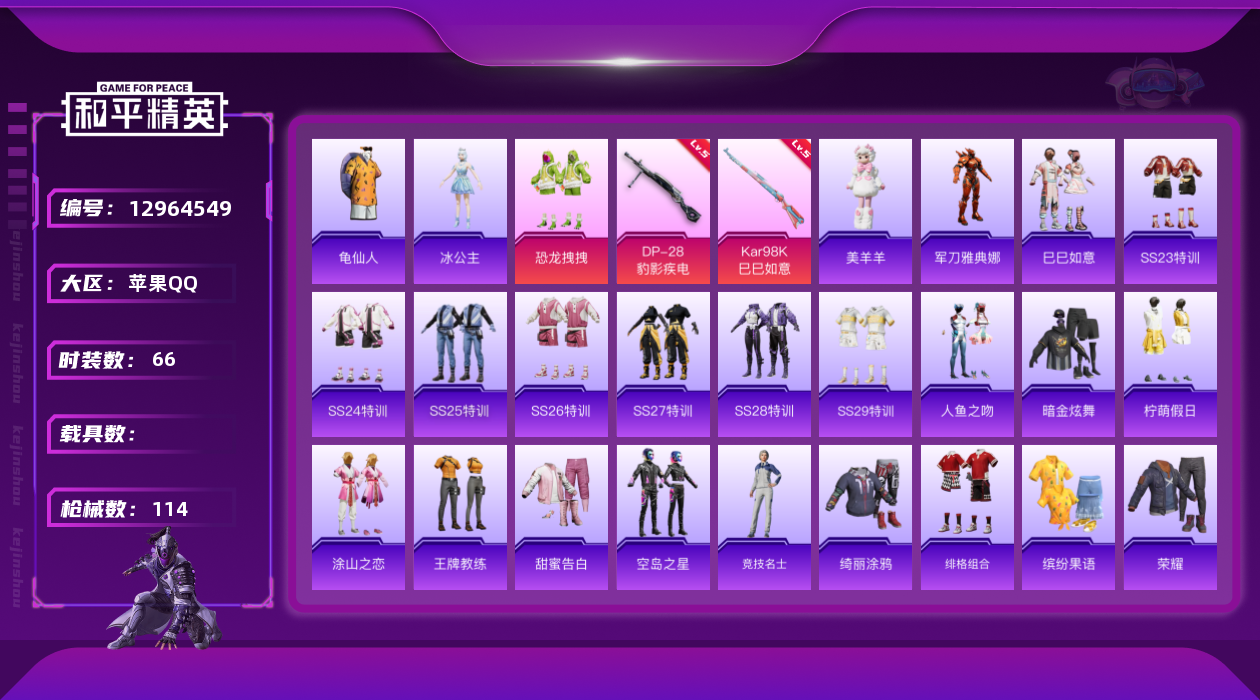 [12964549]【特价急出/详情看图】:苹果 手Q-1粉装-2特效枪-2.9w75热力值-4王牌印记-66套装-114枪皮【热门品类】:角色-军刀雅典娜,套装-龟仙人【粉色套装】:粉装-恐龙拽拽【粉色枪皮等级】:Kar98K-巳巳如意(五级),DP-28-豹影疾电(五级)
