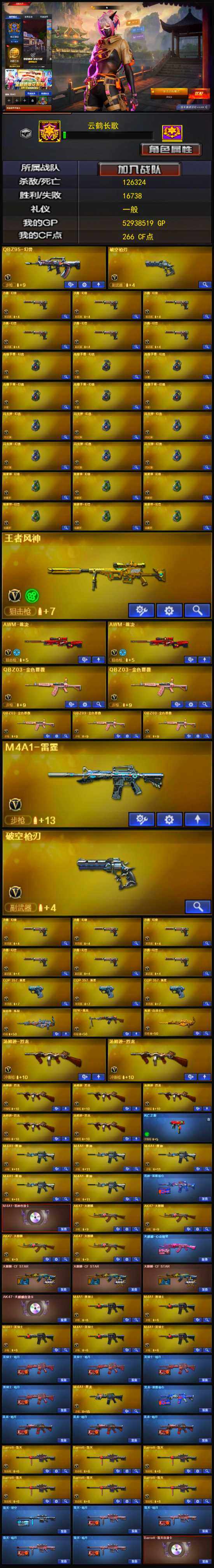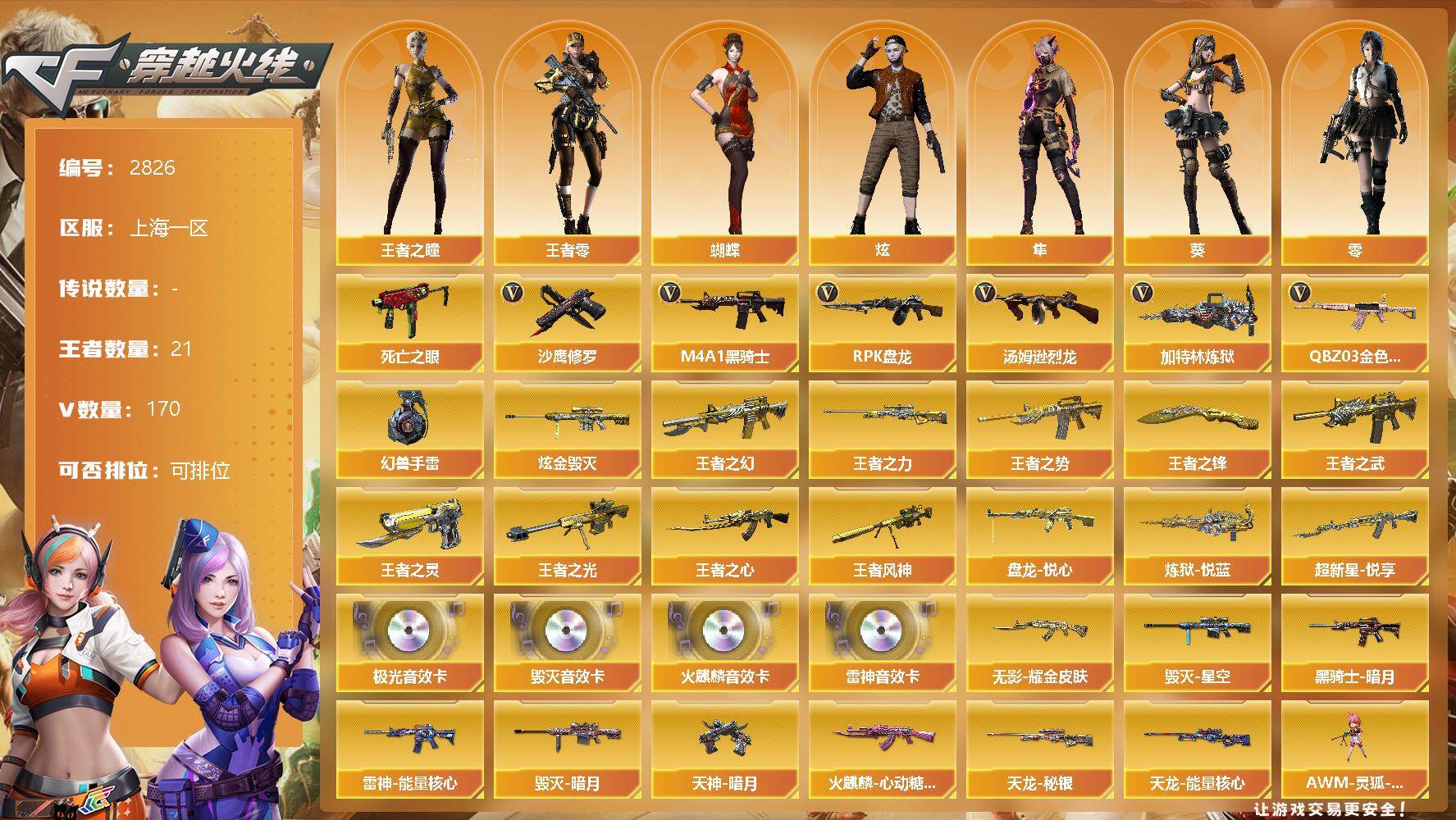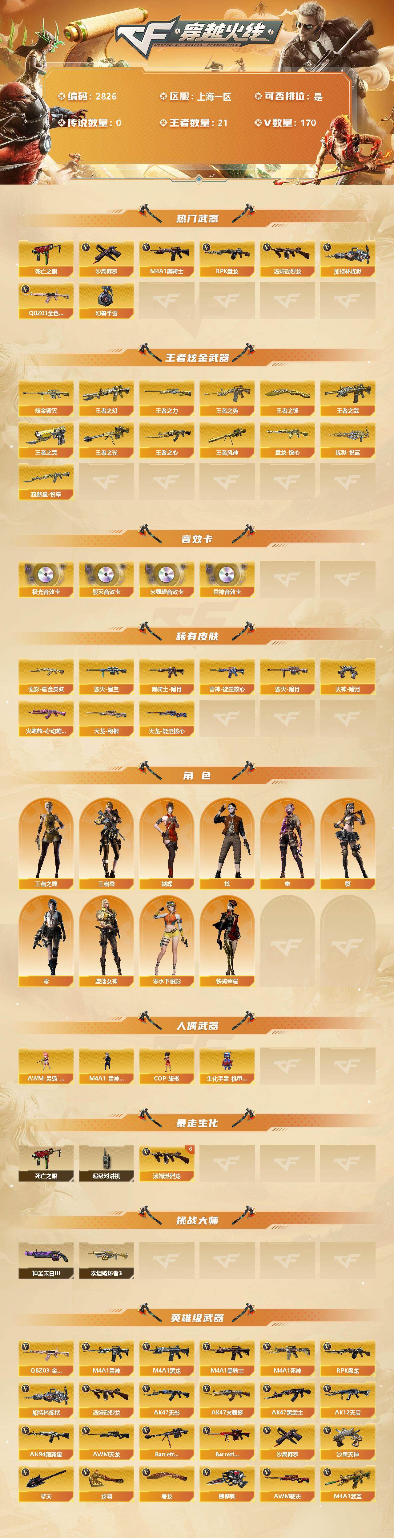 [12966723]上海一区-170V-21王者-1炫金 【热门武器】:QBZ03-金色蔷薇*5,死亡之眼,M4A1-黑骑士*5,汤姆逊-烈龙*7,RPK-盘龙,加特林-炼狱,沙鹰-修罗*6,高爆手雷-幻兽*6 【王者炫金武器】:超新星-悦享*2,王者之幻,王者之势*2,王者之武,王者之心,王者之光,王者之力,王者风神,盘龙-悦心,炼狱-悦蓝,王者之灵,王者之锋*2,炫金毁灭 【音效卡】:AK47-火麒麟音效卡,M4A1-雷神音效卡,Barrett-毁灭音效卡,Barrett-极光音效卡 【稀有皮肤】:雷神-能量核心,火麒麟-心动糖果,毁灭-暗月*4,毁灭-星空,黑骑士-暗月*4,天龙-秘银,天龙-能量核心,无影耀金皮肤,天神-暗月*5 【角色】:零,葵,蝴蝶,炫,隼,王者-零,王者之瞳,堕落女神,零-水下丽影,铁骑荣耀 【人偶武器】:M4A1-雷神-精英刀锋,AWM-灵狐-15周年嘉年华,COP-旗袍,生化手雷-机甲核心 【暴走生化】:死亡之眼,超级对讲机 【挑战大师】:AK47-泰坦破坏者III,神圣爆裂者-末日III 【英雄级武器】:M4A1-千变*3,AK47-火麒麟*4,M4A1-黑龙,M4A1-雷神*5,M4A1-黑骑士*5,AK47-无影,M4A1-死神*3,AK47-黑武士*3,AK12-天启*6,AN94-超新星,M4A1-武圣,AK47-机械迷城*2,M4A1-龙血*2,M4A1-雷霆,无影-神兵利器,QBZ95-幻兽,QBZ03-金色蔷薇*5,AK-47-猩红传说,AWM-天龙*4,Barrett-毁灭*6,Barrett-极光*2,AWM-裁决*2,RPK-盘龙,加特林-炼狱,汤姆逊-烈龙*7,沙鹰-修罗*6,沙鹰-天神*2,沙鹰-幻兽*6,屠龙*8,龙啸*6,擎天,麒麟刺*4,女皇利刃-幻兽,高爆手雷-幻兽*6 【特殊枪械】:5黑骑士,6烈龙,1盘龙,1炼狱