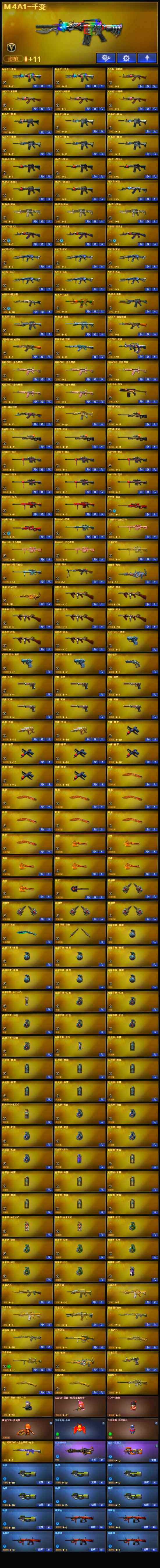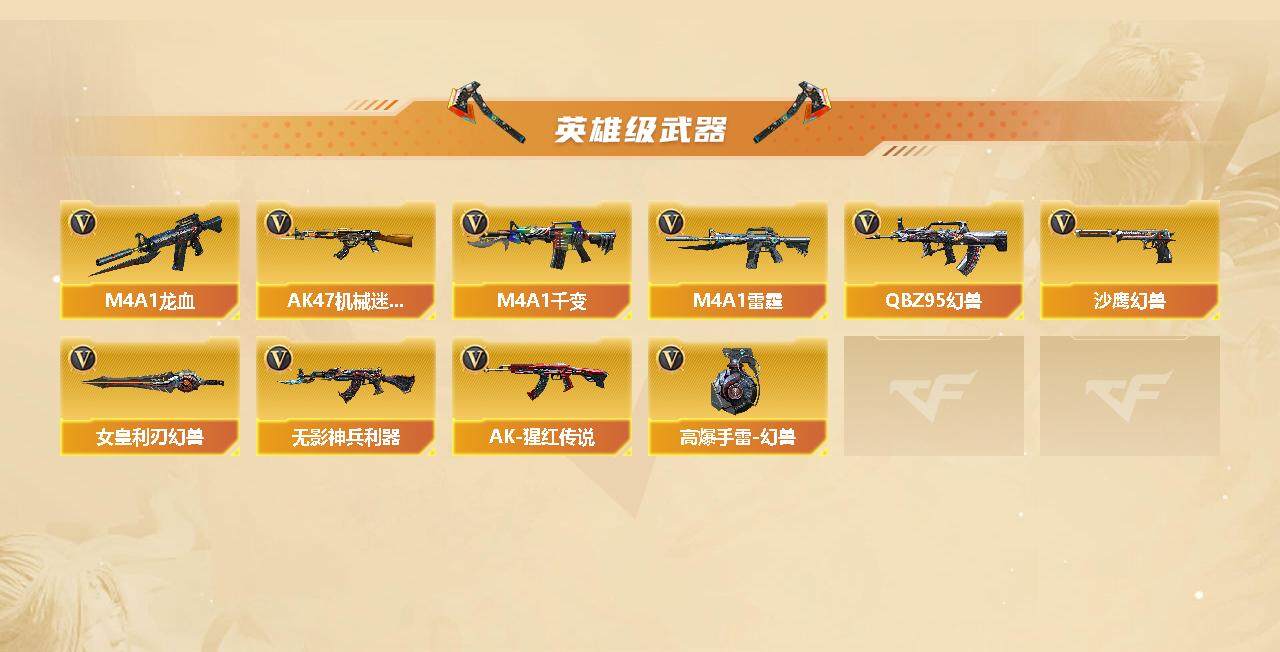【英雄级武器】:M4A1-千变*3,AK47-火麒麟*4,M4A1-黑龙,M4A1-雷神*5,M4A1-黑骑士*5,AK47-无影,M4A1-死神*3,AK47-黑武士*3,AK12-天启*6,AN94-超新星,M4A1-武圣,AK47-机械迷城*2,M4A1-龙血*2,M4A1-雷霆,无影-神兵利器,QBZ95-幻兽,QBZ03-金色蔷薇*5,AK-47-猩红传说,AWM-天龙*4,Barrett-毁灭*6,Barrett-极光*2,AWM-裁决*2,RPK-盘龙,加特林-炼狱,汤姆逊-烈龙*7,沙鹰-修罗*6,沙鹰-天神*2,沙鹰-幻兽*6,屠龙*8,龙啸*6,擎天,麒麟刺*4,女皇利刃-幻兽,高爆手雷-幻兽*6