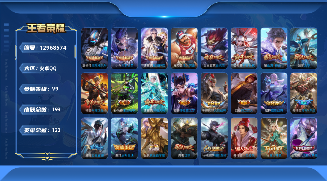[12968574]安卓Q-V6-最强王者段位-123英雄-193皮肤-4典藏-0珍品无双-0无双-0珍品传说-15传说-65史诗