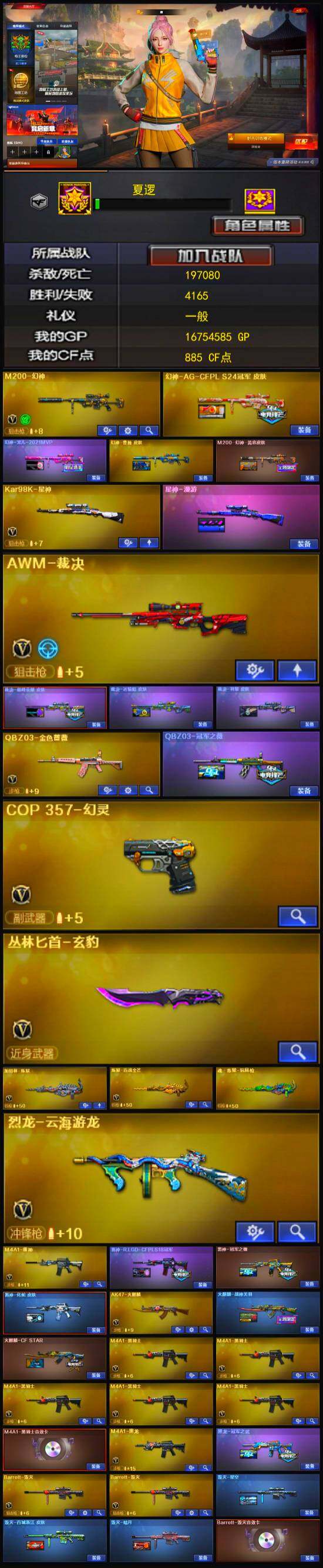 【热门武器】:QBZ03-金色蔷薇,M200-幻神,金色蔷薇-古蛇迷踪,修罗-古蛇迷踪,荣耀世冠-火麒麟,Kar98K-星神,M4A1-黑骑士*5,加特林-炼狱,COP 357-幻灵,沙鹰-修罗*4