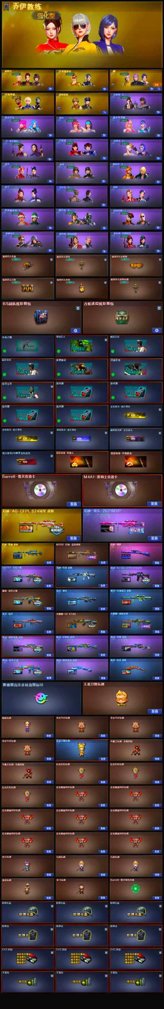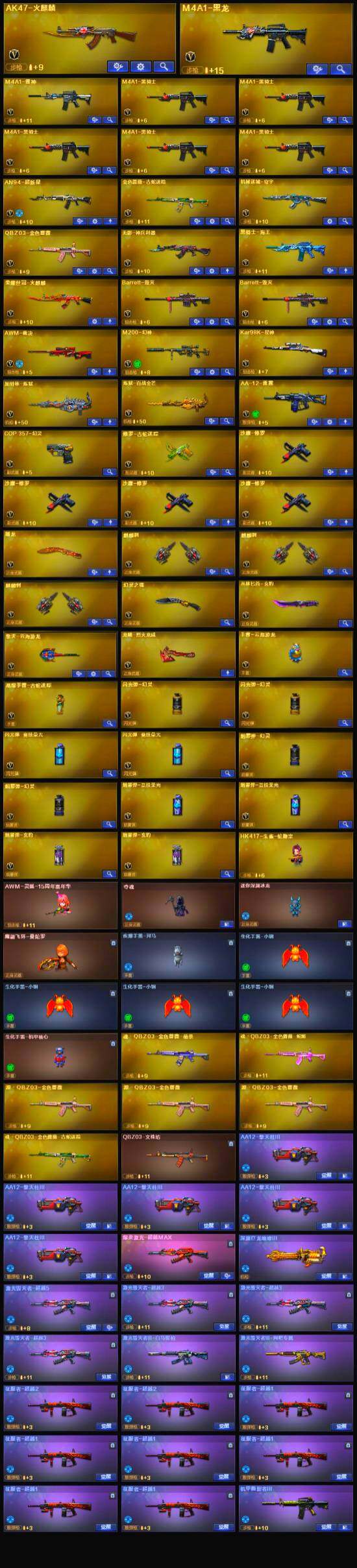 【英雄级武器】:AK47-火麒麟,M4A1-黑龙,M4A1-雷神,M4A1-黑骑士*5,AN94-超新星,无影-神兵利器,金色蔷薇-古蛇迷踪,QBZ03-金色蔷薇,黑骑士-海王,荣耀世冠-火麒麟,Barrett-毁灭*2,AWM-裁决,M200-幻神,Kar98K-星神,加特林-炼狱,AA-12-雷霆,沙鹰-修罗*4,COP 357-幻灵,修罗-古蛇迷踪,屠龙,麒麟刺*3,幻灵之锋,擎天-云海游龙,屠龙-云海游龙,闪光弹-竞技荣光*2,烟雾弹-竞技荣光*2,M4A1-赤狱骑士
