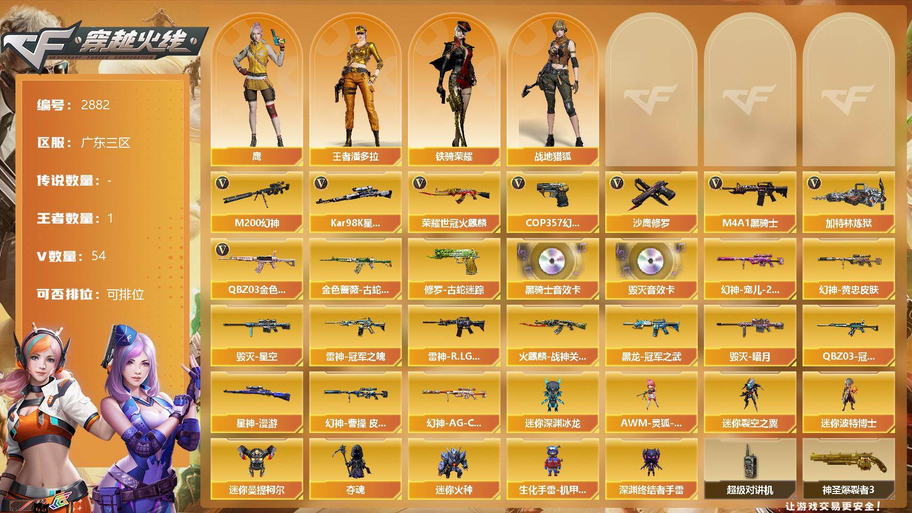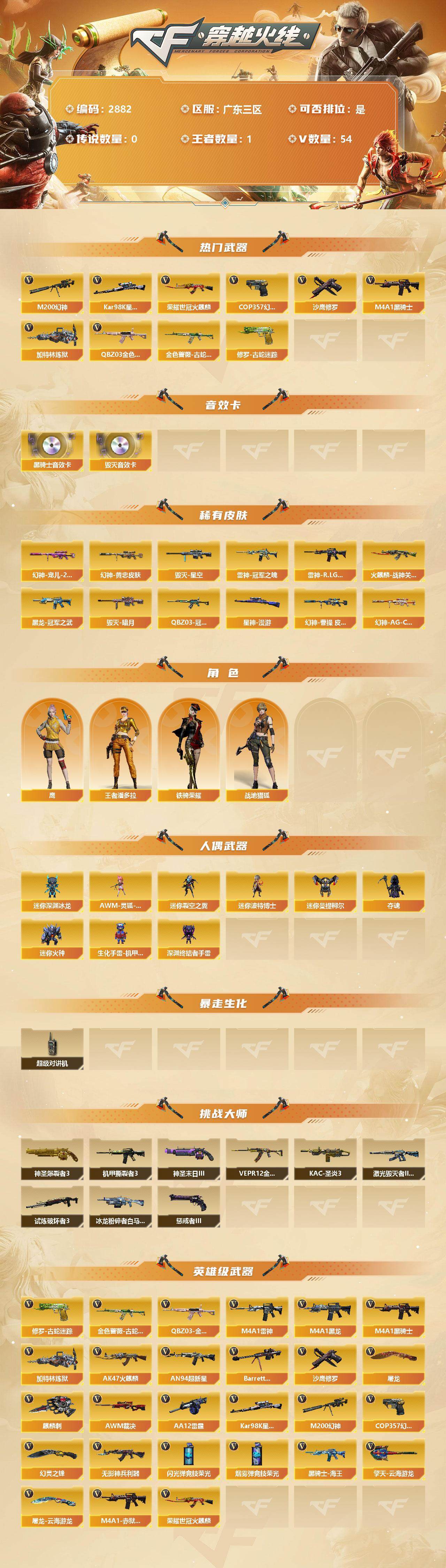 [12969148]广东三区-54V-1王者-0炫金 【热门武器】:QBZ03-金色蔷薇,M200-幻神,金色蔷薇-古蛇迷踪,修罗-古蛇迷踪,荣耀世冠-火麒麟,Kar98K-星神,M4A1-黑骑士*5,加特林-炼狱,COP 357-幻灵,沙鹰-修罗*4 【音效卡】:M4A1-黑骑士音效卡,Barrett-毁灭音效卡 【稀有皮肤】:M200-幻神-黄忠皮肤,幻神-宠儿-2021MVP,幻神-曹操 皮肤,幻神-AG-CFPL S24冠军 皮肤,QBZ03-冠军之薇,裁决-巅峰荣耀 皮肤,裁决-羽掣 皮肤,裁决-运输船 皮肤,星神-漫游,雷神-冠军之魄,雷神-R.LGD-CFPLS18冠军,火麒麟-战神关羽,毁灭-暗月,毁灭-星空,黑龙-冠军之武 【角色】:鹰,战地猎狐,王者潘多拉,铁骑荣耀 【人偶武器】:AWM-灵狐-15周年嘉年华,迷你深渊冰龙,迷你裂空之翼,迷你波特博士*2,迷你曼提柯尔,夺魂,迷你火种,生化手雷-机甲核心,深渊终结者手雷 【暴走生化】:超级对讲机 【挑战大师】:神圣爆裂者III,冰龙粉碎者-白马银枪,激光毁灭者III-白马银枪,VEPR-12-金魔,机甲撕裂者III,试炼破坏者III,KAC-圣炎切割者III,神圣爆裂者-末日III,惩戒者III 【英雄级武器】:AK47-火麒麟,M4A1-黑龙,M4A1-雷神,M4A1-黑骑士*5,AN94-超新星,无影-神兵利器,金色蔷薇-古蛇迷踪,QBZ03-金色蔷薇,黑骑士-海王,荣耀世冠-火麒麟,Barrett-毁灭*2,AWM-裁决,M200-幻神,Kar98K-星神,加特林-炼狱,AA-12-雷霆,沙鹰-修罗*4,COP 357-幻灵,修罗-古蛇迷踪,屠龙,麒麟刺*3,幻灵之锋,擎天-云海游龙,屠龙-云海游龙,闪光弹-竞技荣光*2,烟雾弹-竞技荣光*2,M4A1-赤狱骑士 【特殊枪械】:5黑骑士,1炼狱