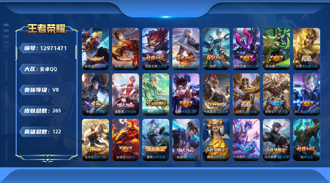 [12971471]安卓Q-V3-至尊星耀III段位-121英雄-265皮肤-2典藏-0珍品无双-0无双-0珍品传说-17传说-66史诗 【荣耀典藏】:孙悟空全息碎影,芈月大秦宣太后 【内测皮肤】:孙尚香蔷薇恋人,狂铁特工战影 【传说皮肤】:狄仁杰超时空战士,孙悟空地狱火,宫本武藏地狱之眼,孙尚香末日机甲,李白凤求凰,貂蝉仲夏夜之梦,诸葛亮武陵仙君,后羿黄金射手座,花木兰冠军飞将,百里玄策白虎志,达摩黄金狮子座,干将莫邪久胜战神,伽罗太华,李信一念神魔,孙悟空零号赤焰,虞姬启明星使,桑启鸣野蒿 【限定皮肤】:白起狰,姜子牙天穹之誓,杨戬破阵退雄兵,狄仁杰阴阳师,虞姬凯尔特女王,赵云皇家上将,嬴政白昼王子,孙尚香蔷薇恋人,鲁班七号狮舞东方,孙膑妖精王,扁鹊炼金王,芈月重明,吕布猎兽之王,周瑜赤莲之焰,夏侯惇朔风刀,曹操烛龙,典韦穷奇,典韦蓝屏警告,马可波罗暗影游猎,狄仁杰魔术师,狄仁杰万华元夜,达摩沙漠行僧,项羽海滩派对,老夫子醍醐杖,安琪拉魔法小厨娘,程咬金演武夺筹,露娜一生所爱,韩信逐梦之影,兰陵王驯魔猎人,兰陵王金庭之子,花木兰青春决赛季,孙悟空至尊宝,孙悟空大圣娶亲,孙悟空零号赤焰,牛魔御旌,李元芳银河之约,李元芳云中旅人,虞姬霸王别姬,虞姬启明星使,钟馗神迹守卫,钟馗驱傩正仪,杨玉环遇见飞天,女娲朔望之晖,干将莫邪冰霜恋舞曲,雅典娜单词大作战,雅典娜黎明之约,蔡文姬繁星吟游,太乙真人饕餮,鬼谷子原初探秘者,诸葛亮武陵仙君,铠青龙志,苏烈千军破阵,百里玄策白虎志,百里玄策原初追逐者,百里守约朱雀志,弈星混沌棋,沈梦溪星空之诺,沈梦溪大漠名商,明世隐疑决卦,裴擒虎李小龙,裴擒虎擒涛扼浪,狂铁御狮,米莱狄御霄,云中君纤云弄巧,伽罗太华,盾山御銮,猪八戒西部大镖客,上官婉儿梁祝,蒙犽狂想玩偶喵,鲁班大师探海日志,桑启海盐诗旅,张良古海寻踪,蒙犽百解令,鬼谷子天穹祈灯,姬小满妄想食味,刘邦剑破天穹,周瑜熔金海岸 【年限皮肤】:百里玄策白虎志,百里守约朱雀志,铠青龙志,李白凤求凰,伽罗太华 【赛季限定】:孙膑妖精王,扁鹊炼金王,白起狰,芈月重明,夏侯惇朔风刀,曹操烛龙,典韦穷奇,狄仁杰万华元夜,达摩沙漠行僧,老夫子醍醐杖,程咬金演武夺筹,兰陵王金庭之子,张良古海寻踪,牛魔御旌,李元芳云中旅人,虞姬凯尔特女王,钟馗驱傩正仪,雅典娜黎明之约,太乙真人饕餮,鬼谷子原初探秘者,苏烈千军破阵,百里