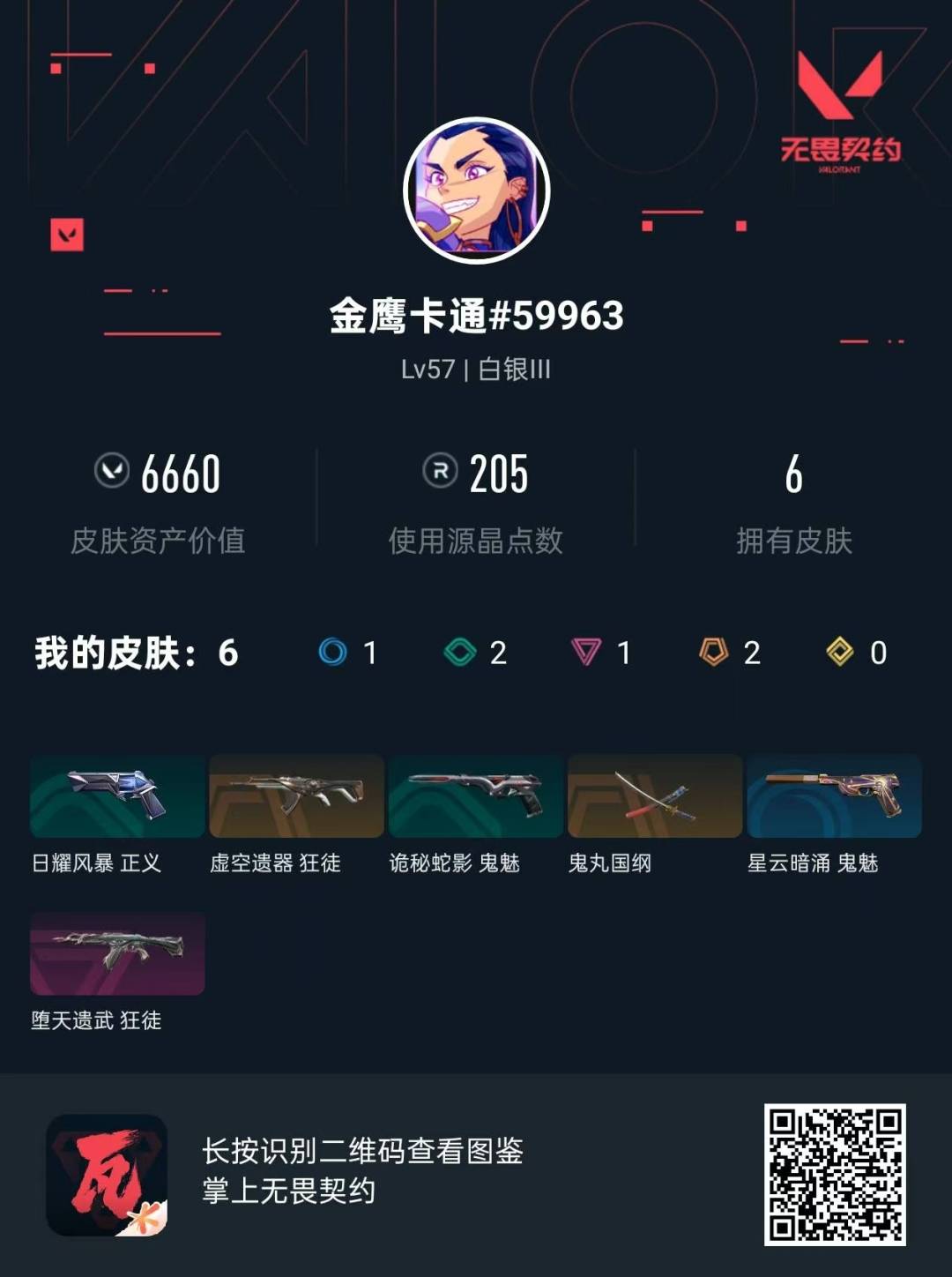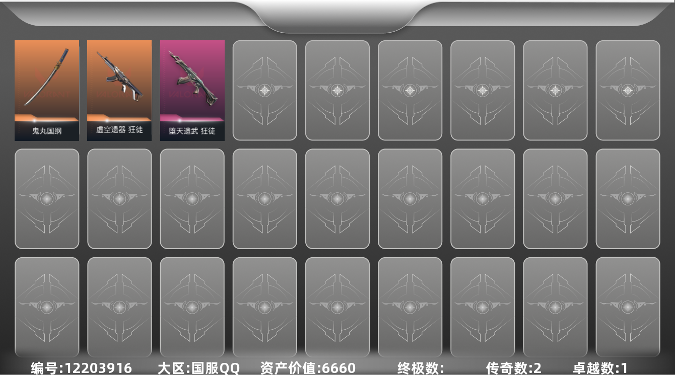 [12203916]2橙皮 1紫皮 6皮肤 15英雄 37卡面 205已用源晶 白银 优质装备:鬼丸国纲 步枪皮肤:狂徒-虚空遗器,狂徒-堕天遗武