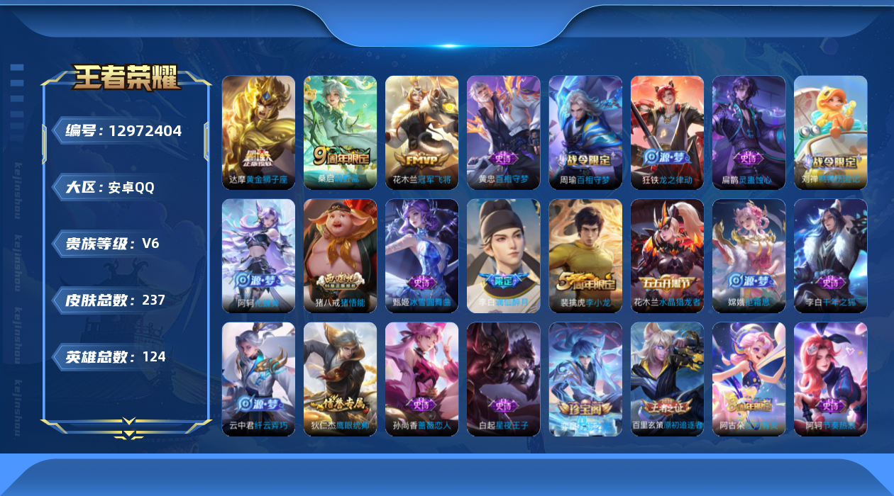 [12972404]安卓Q-V6-至尊星耀III段位-124英雄-237皮肤-0典藏-0珍品无双-0无双-0珍品传说-3传说-44史诗