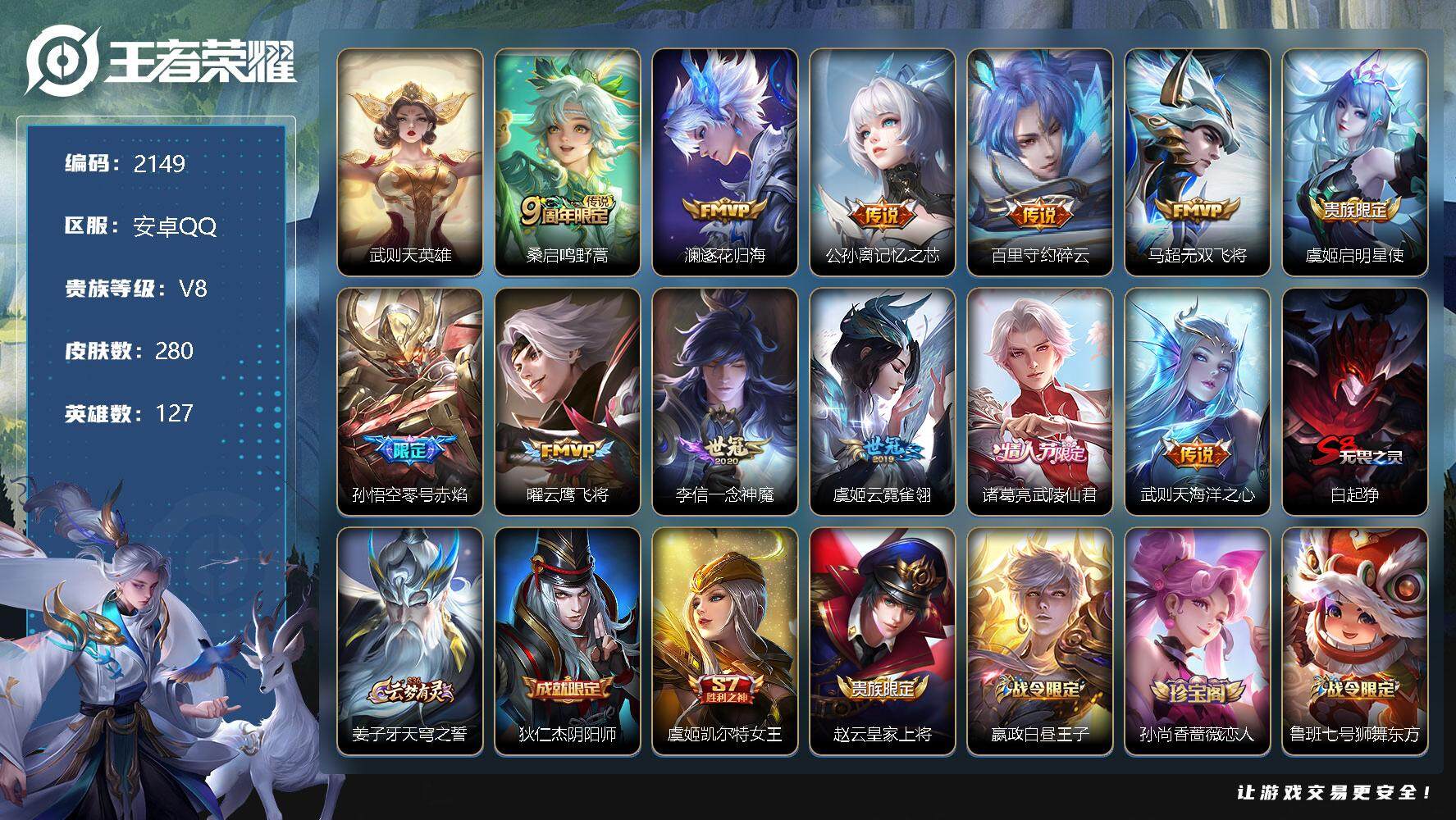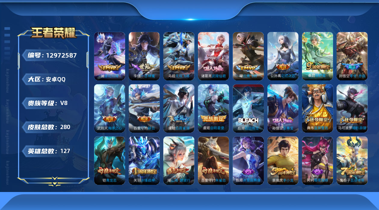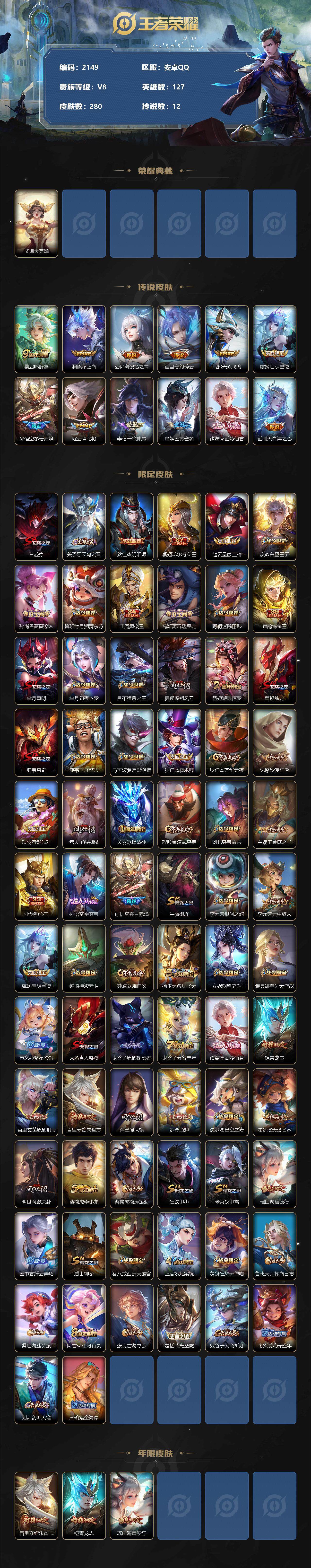 [12972587]安卓Q-V8-永恒钻石II段位-127英雄-280皮肤-0典藏-0珍品无双-0无双-0珍品传说-12传说-65史诗