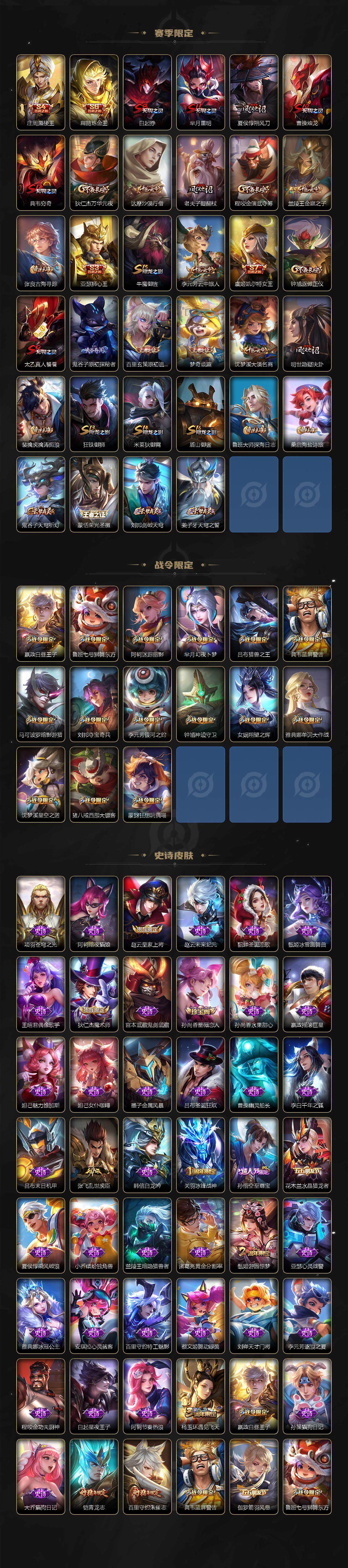 【赛季限定】:庄周蜃楼王,扁鹊炼金王,白起狰,芈月重明,夏侯惇朔风刀,曹操烛龙,典韦穷奇,狄仁杰万华元夜,达摩沙漠行僧,老夫子醍醐杖,程咬金演武夺筹,兰陵王金庭之子,张良古海寻踪,亚瑟狮心王,牛魔御旌,李元芳云中旅人,虞姬凯尔特女王,钟馗驱傩正仪,太乙真人饕餮,鬼谷子原初探秘者,百里玄策原初追逐者,弈星混沌棋,梦奇顽趣,沈梦溪大漠名商,明世隐疑决卦,裴擒虎擒涛扼浪,狂铁御狮,米莱狄御霄,盾山御銮,鲁班大师探海日志,桑启海盐诗旅,鬼谷子天穹祈灯,蒙恬荣光圣徽,刘邦剑破天穹,姜子牙天穹之誓