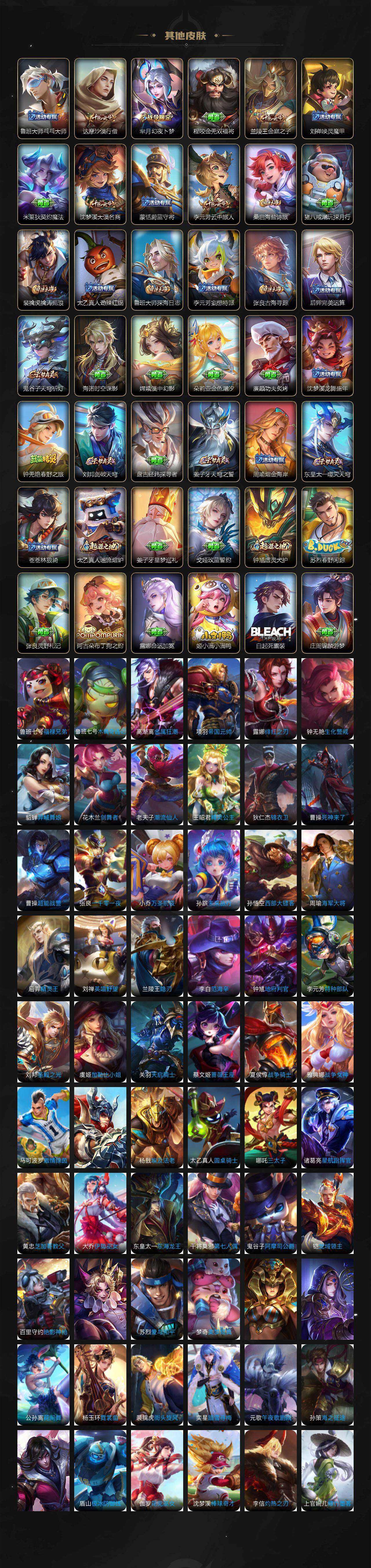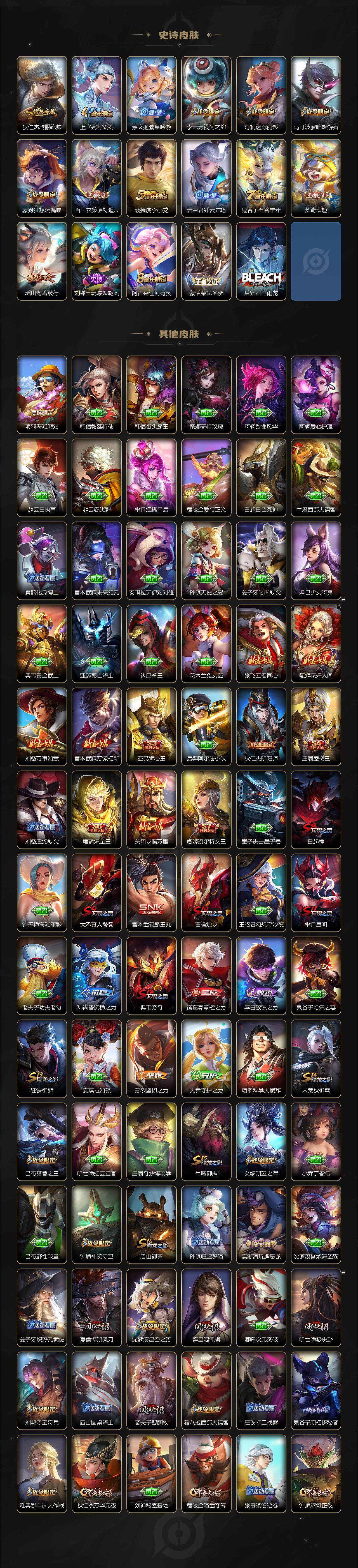 【限定皮肤】:白起狰,姜子牙天穹之誓,狄仁杰阴阳师,虞姬凯尔特女王,赵云皇家上将,嬴政白昼王子,孙尚香蔷薇恋人,鲁班七号狮舞东方,庄周蜃楼王,高渐离玩趣恶龙,阿轲迷踪丽影,扁鹊炼金王,芈月重明,芈月幻夜卜梦,吕布猎兽之王,夏侯惇朔风刀,甄姬游园惊梦,曹操烛龙,典韦穷奇,典韦蓝屏警告,马可波罗暗影游猎,狄仁杰魔术师,狄仁杰万华元夜,达摩沙漠行僧,项羽海滩派对,老夫子醍醐杖,关羽冰锋战神,程咬金演武夺筹,刘邦夺宝奇兵,兰陵王金庭之子,亚瑟狮心王,孙悟空至尊宝,孙悟空零号赤焰,牛魔御旌,李元芳银河之约,李元芳云中旅人,虞姬启明星使,钟馗神迹守卫,钟馗驱傩正仪,杨玉环遇见飞天,女娲朔望之晖,雅典娜单词大作战,蔡文姬繁星吟游,太乙真人饕餮,鬼谷子原初探秘者,鬼谷子五谷丰年,诸葛亮武陵仙君,铠青龙志,百里玄策原初追逐者,百里守约朱雀志,弈星混沌棋,梦奇顽趣,沈梦溪星空之诺,沈梦溪大漠名商,明世隐疑决卦,裴擒虎李小龙,裴擒虎擒涛扼浪,狂铁御狮,米莱狄御霄,瑶山海碧波行,云中君纤云弄巧,盾山御銮,猪八戒西部大镖客,上官婉儿梁祝,蒙犽狂想玩偶喵,鲁班大师探海日志,桑启海盐诗旅,阿古朵江河有灵,张良古海寻踪,蒙恬荣光圣徽,鬼谷子天穹祈灯,沈梦溪龙舞盛年,刘邦剑破天穹,周瑜熔金海岸