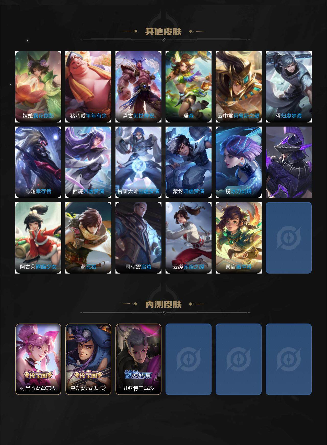 亚瑟狮心王,庄周蜃楼王,扁鹊炼金王,虞姬凯尔特女王,白起狰,太乙真人饕餮,曹操烛龙,芈月重明,典韦穷奇,狂铁御狮,米莱狄御霄,牛魔御旌,盾山御銮,夏侯惇朔风刀,明世隐疑决卦,老夫子醍醐杖,鬼谷子原初探秘者,狄仁杰万华元夜,程咬金演武夺筹,钟馗驱傩正仪,吕布猎兽之王,嬴政白昼王子,女娲朔望之晖,典韦蓝屏警告,钟馗神迹守卫,鲁班七号狮舞东方,沈梦溪星空之诺,李元芳银河之约,刘邦夺宝奇兵,马可波罗暗影游猎,蒙犽狂想玩偶喵,弈星混沌棋,达摩沙漠行僧,兰陵王金庭之子,沈梦溪大漠名商,李元芳云中旅人,桑启海盐诗旅,裴擒虎擒涛扼浪,鲁班大师探海日志,张良古海寻踪