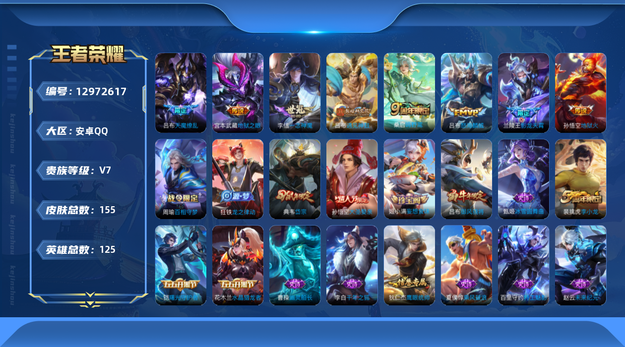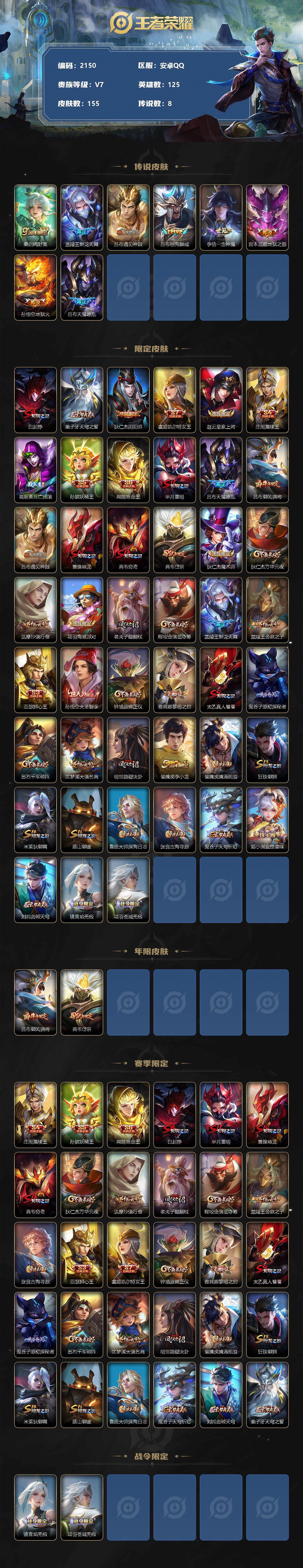 [12972617]安卓Q-V7-至尊星耀I段位-125英雄-155皮肤-0典藏-0珍品无双-0无双-0珍品传说-8传说-30史诗