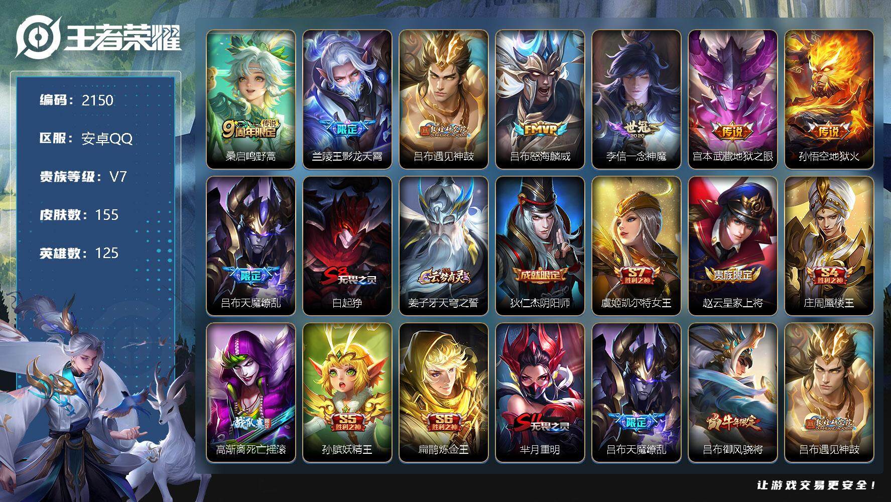 [12972617]安卓Q-V7-至尊星耀I段位-125英雄-155皮肤-0典藏-0珍品无双-0无双-0珍品传说-8传说-30史诗 【传说皮肤】:桑启鸣野蒿,兰陵王影龙天霄,吕布遇见神鼓,吕布怒海麟威,李信一念神魔,宫本武藏地狱之眼,孙悟空地狱火,吕布天魔缭乱 【限定皮肤】:白起狰,姜子牙天穹之誓,狄仁杰阴阳师,虞姬凯尔特女王,赵云皇家上将,庄周蜃楼王,高渐离死亡摇滚,孙膑妖精王,扁鹊炼金王,芈月重明,吕布天魔缭乱,吕布御风骁将,吕布遇见神鼓,曹操烛龙,典韦穷奇,典韦岱宗,狄仁杰魔术师,狄仁杰万华元夜,达摩沙漠行僧,项羽海滩派对,老夫子醍醐杖,程咬金演武夺筹,兰陵王影龙天霄,兰陵王金庭之子,亚瑟狮心王,孙悟空大圣娶亲,钟馗驱傩正仪,雅典娜黎明之约,太乙真人饕餮,鬼谷子原初探秘者,苏烈千军破阵,沈梦溪大漠名商,明世隐疑决卦,裴擒虎李小龙,裴擒虎擒涛扼浪,狂铁御狮,米莱狄御霄,盾山御銮,鲁班大师探海日志,张良古海寻踪,鬼谷子天穹祈灯,姬小满妄想食味,刘邦剑破天穹,镜青焰无极,项羽苍威无极 【年限皮肤】:吕布御风骁将,典韦岱宗 【赛季限定】:庄周蜃楼王,孙膑妖精王,扁鹊炼金王,白起狰,芈月重明,曹操烛龙,典韦穷奇,狄仁杰万华元夜,达摩沙漠行僧,老夫子醍醐杖,程咬金演武夺筹,兰陵王金庭之子,张良古海寻踪,亚瑟狮心王,虞姬凯尔特女王,钟馗驱傩正仪,雅典娜黎明之约,太乙真人饕餮,鬼谷子原初探秘者,苏烈千军破阵,沈梦溪大漠名商,明世隐疑决卦,裴擒虎擒涛扼浪,狂铁御狮,米莱狄御霄,盾山御銮,鲁班大师探海日志,鬼谷子天穹祈灯,刘邦剑破天穹,姜子牙天穹之誓 【战令限定】:镜青焰无极,项羽苍威无极 【史诗皮肤】:赵云皇家上将,赵云未来纪元,甄姬冰雪圆舞曲,狄仁杰魔术师,宫本武藏鬼剑武藏,孙尚香水果甜心,妲己魅力维加斯,吕布圣诞狂欢,曹操幽灵船长,李白千年之狐,张飞乱世虎臣,韩信白龙吟,花木兰水晶猎龙者,刘邦德古拉伯爵,夏侯惇乘风破浪,兰陵王暗隐猎兽者,亚瑟心灵战警,百里守约特工魅影,铠曙光守护者,孙悟空大圣娶亲,狄仁杰鹰眼统帅,典韦岱宗,裴擒虎李小龙,吕布御风骁将,雅典娜黎明之约,姬小满妄想食味,镜青焰无极,牛魔星界战将,狂铁龙之律动,周瑜百相守梦 【其他皮肤】:项羽海滩派对,韩信教廷特使,韩信街头霸王,阿轲致命风华,赵云忍炎影,白起白色死神,牛魔西部大镖客,武则天东方不败,扁鹊化身博士,安琪拉玩偶对对碰