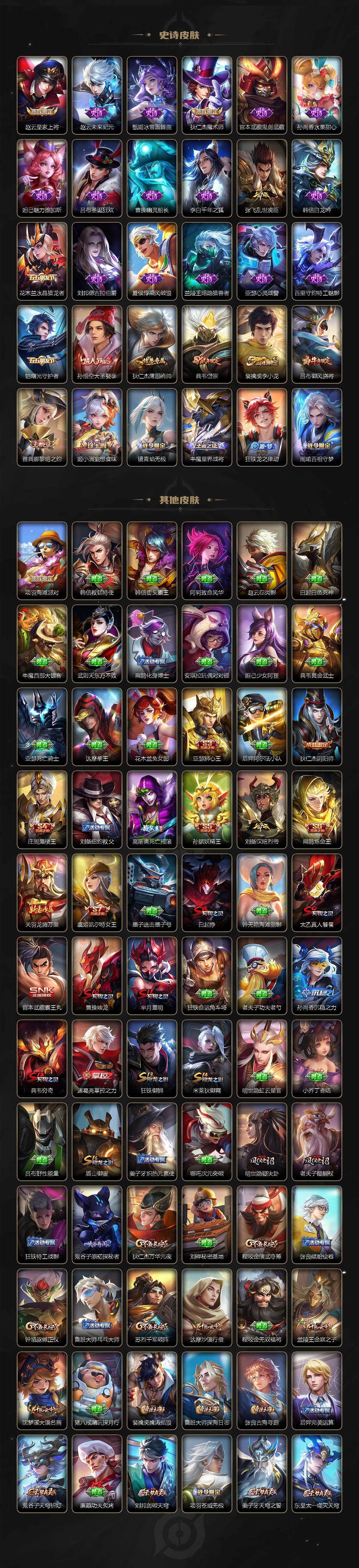 【史诗皮肤】:赵云皇家上将,赵云未来纪元,甄姬冰雪圆舞曲,狄仁杰魔术师,宫本武藏鬼剑武藏,孙尚香水果甜心,妲己魅力维加斯,吕布圣诞狂欢,曹操幽灵船长,李白千年之狐,张飞乱世虎臣,韩信白龙吟,花木兰水晶猎龙者,刘邦德古拉伯爵,夏侯惇乘风破浪,兰陵王暗隐猎兽者,亚瑟心灵战警,百里守约特工魅影,铠曙光守护者,孙悟空大圣娶亲,狄仁杰鹰眼统帅,典韦岱宗,裴擒虎李小龙,吕布御风骁将,雅典娜黎明之约,姬小满妄想食味,镜青焰无极,牛魔星界战将,狂铁龙之律动,周瑜百相守梦
