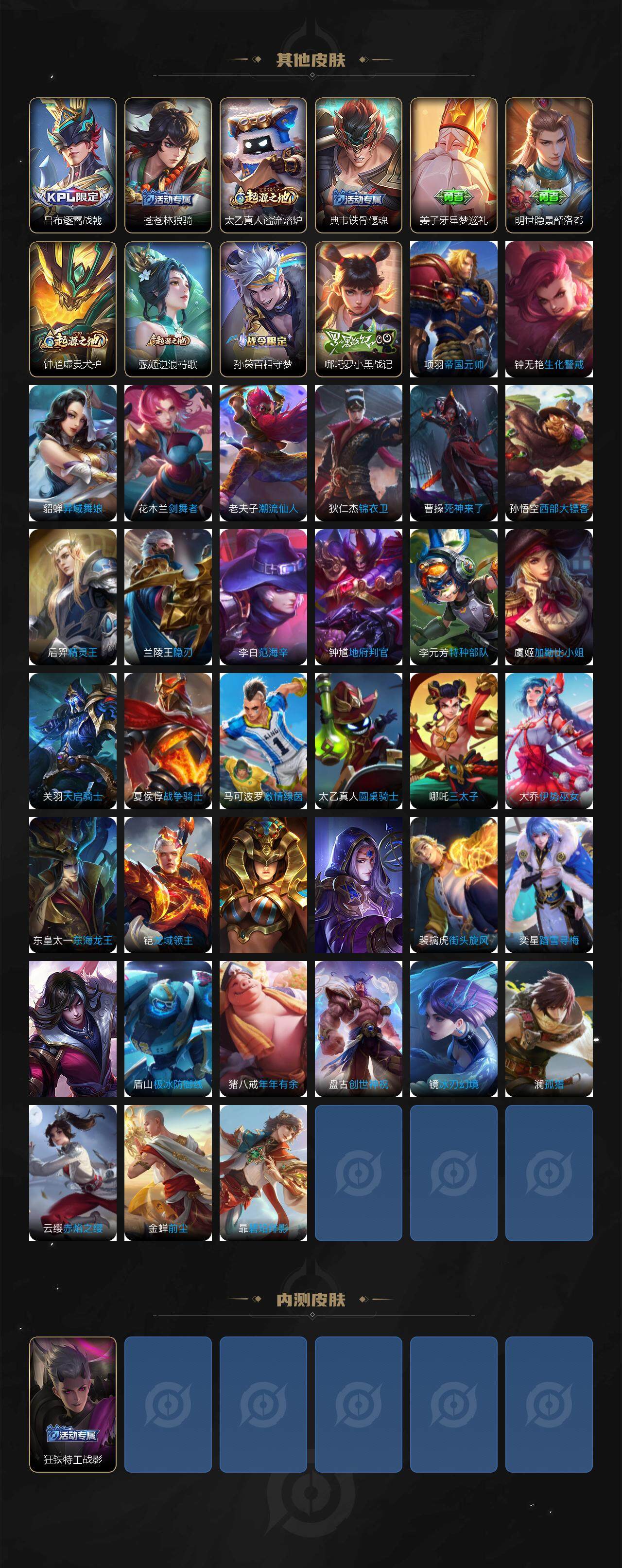 【赛季限定】:庄周蜃楼王,孙膑妖精王,扁鹊炼金王,白起狰,芈月重明,曹操烛龙,典韦穷奇,狄仁杰万华元夜,达摩沙漠行僧,老夫子醍醐杖,程咬金演武夺筹,兰陵王金庭之子,张良古海寻踪,亚瑟狮心王,虞姬凯尔特女王,钟馗驱傩正仪,雅典娜黎明之约,太乙真人饕餮,鬼谷子原初探秘者,苏烈千军破阵,沈梦溪大漠名商,明世隐疑决卦,裴擒虎擒涛扼浪,狂铁御狮,米莱狄御霄,盾山御銮,鲁班大师探海日志,鬼谷子天穹祈灯,刘邦剑破天穹,姜子牙天穹之誓