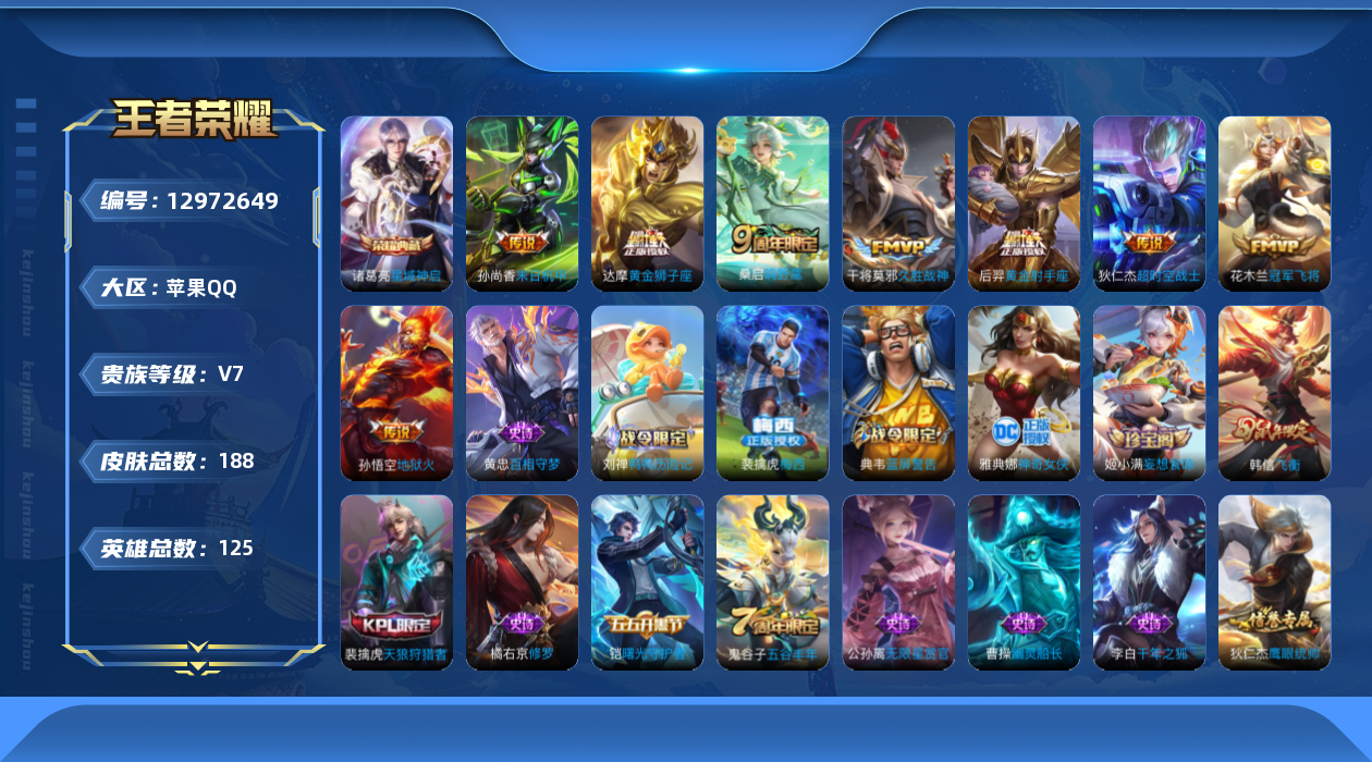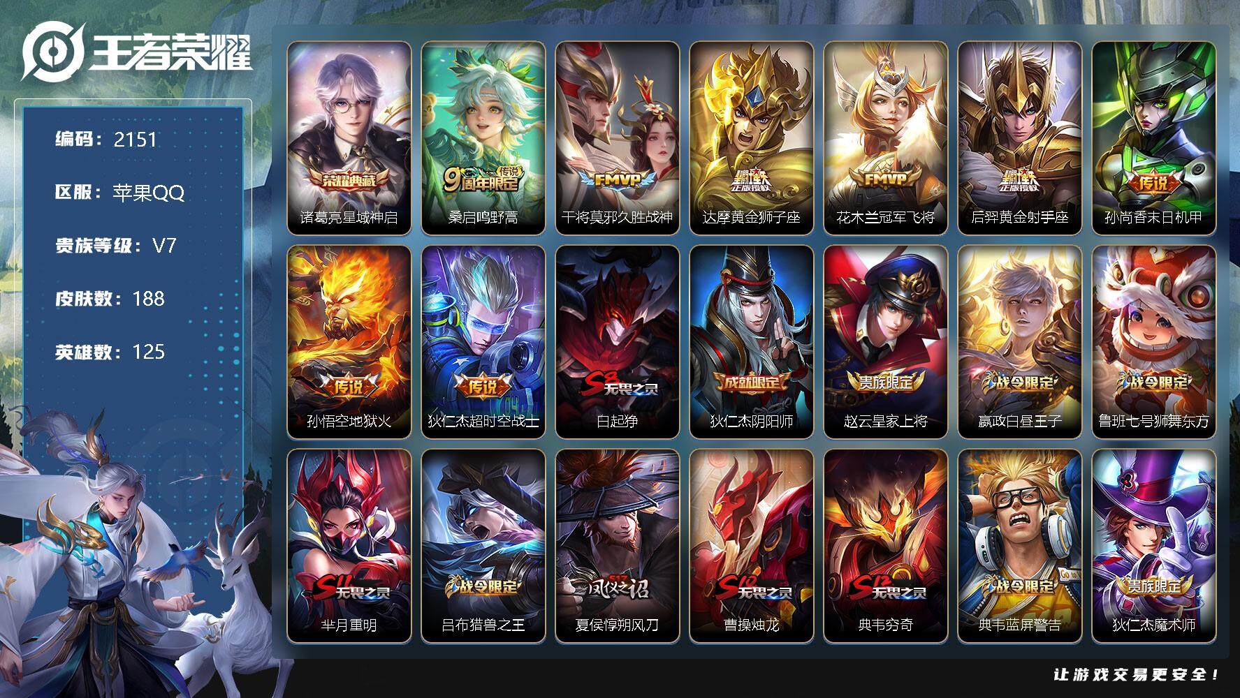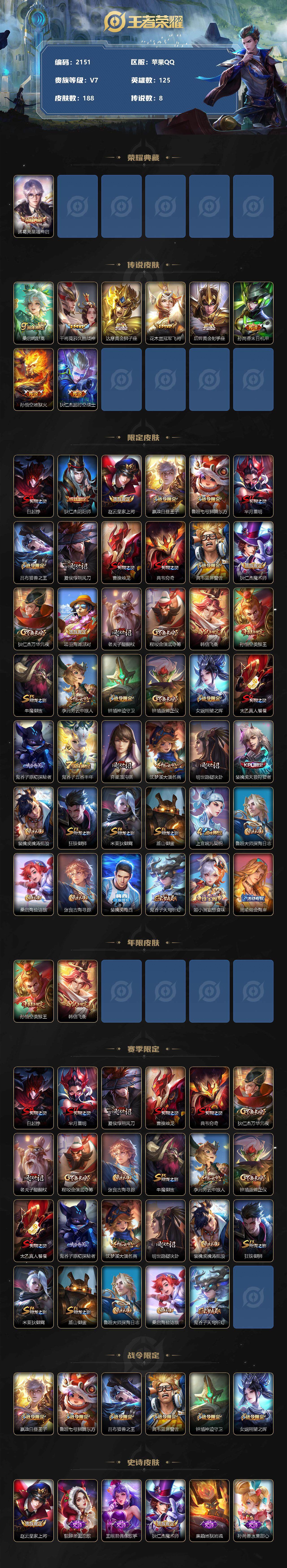 [12972649]苹果Q-V7-永恒钻石II段位-125英雄-188皮肤-1典藏-0珍品无双-0无双-0珍品传说-8传说-35史诗