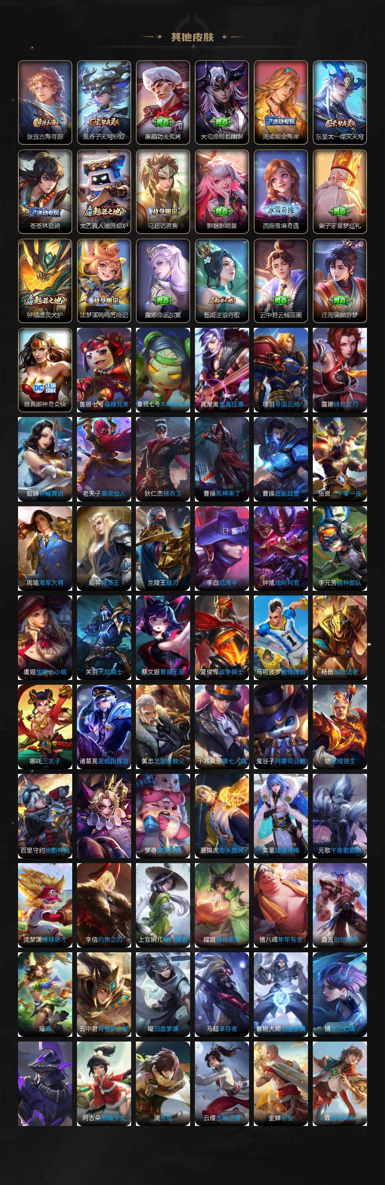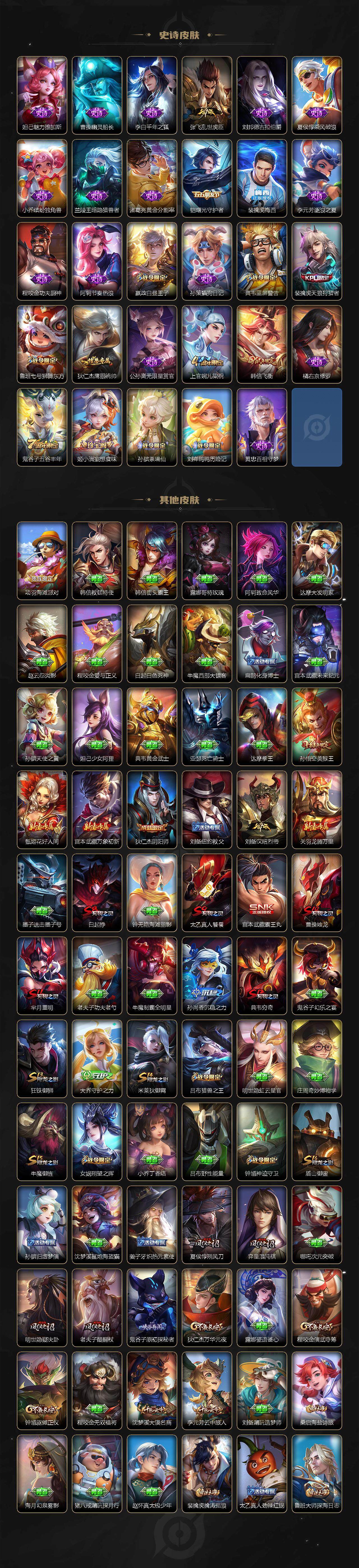 【史诗皮肤】:赵云皇家上将,貂蝉圣诞恋歌,王昭君偶像歌手,狄仁杰魔术师,廉颇地狱岩魂,孙尚香水果甜心,妲己魅力维加斯,曹操幽灵船长,李白千年之狐,张飞乱世虎臣,刘邦德古拉伯爵,夏侯惇乘风破浪,小乔缤纷独角兽,兰陵王暗隐猎兽者,诸葛亮黄金分割率,铠曙光守护者,裴擒虎梅西,李元芳逐浪之夏,程咬金功夫厨神,阿轲节奏热浪,嬴政白昼王子,孙策猫狗日记,典韦蓝屏警告,裴擒虎天狼狩猎者,鲁班七号狮舞东方,狄仁杰鹰眼统帅,公孙离无限星赏官,上官婉儿梁祝,韩信飞衡,橘右京修罗,鬼谷子五谷丰年,姬小满妄想食味,孙膑茶境仙,刘禅鸭鸭历险记,黄忠百相守梦