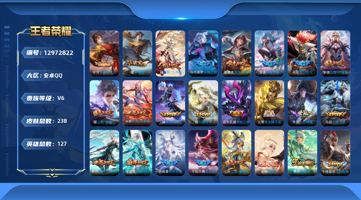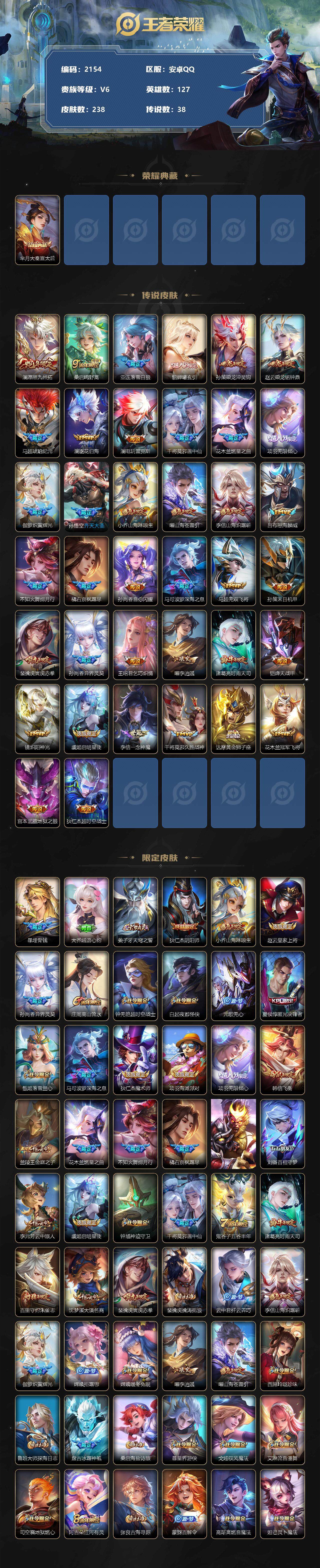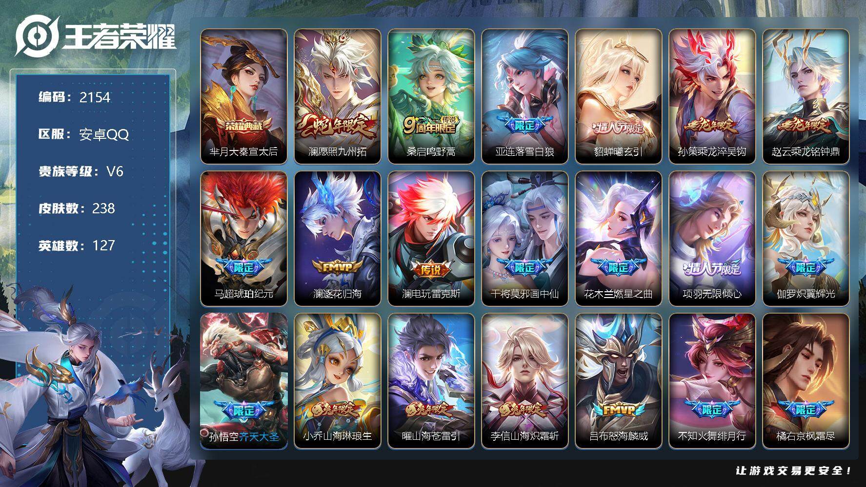[12972822]安卓Q-V6-最强王者段位-127英雄-238皮肤-1典藏-0珍品无双-0无双-0珍品传说-38传说-66史诗