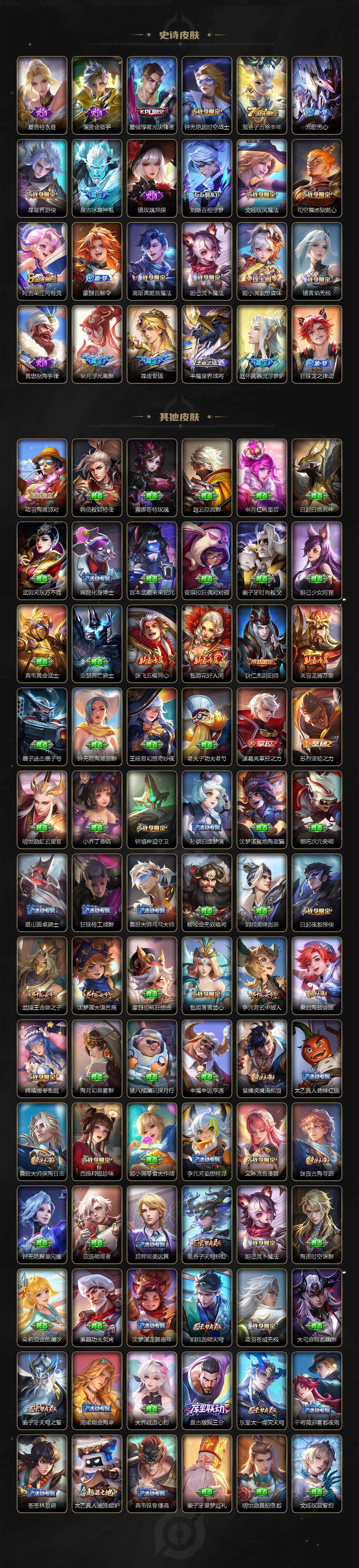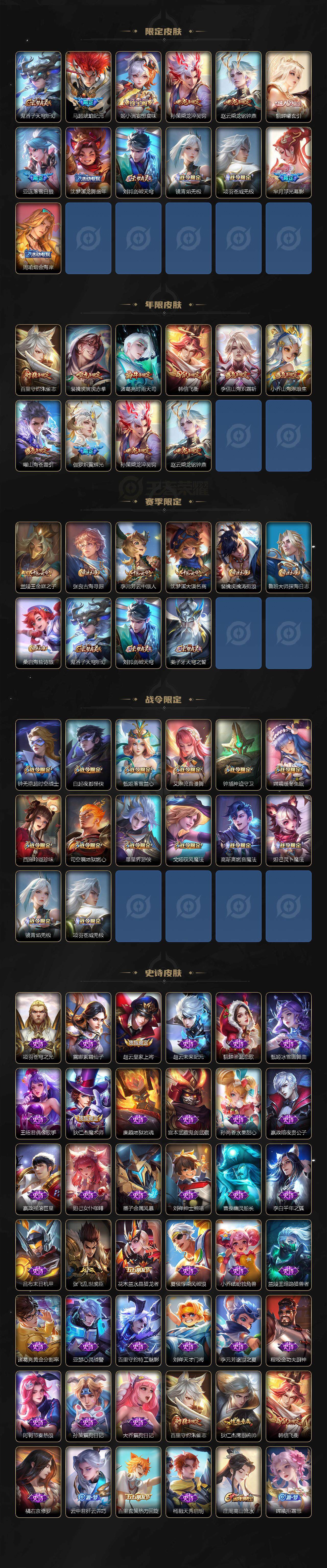 【限定皮肤】:暃埋骨钱,大乔绒语心约,姜子牙天穹之誓,狄仁杰阴阳师,小乔山海琳琅生,赵云皇家上将,孙尚香异界灵契,庄周高山流水,钟无艳超时空战士,白起夜都怪侠,元歌无心,夏侯惇匿光决锋者,甄姬落雪兰心,马可波罗深海之息,狄仁杰魔术师,项羽海滩派对,项羽无限倾心,韩信飞衡,兰陵王金庭之子,花木兰燃星之曲,不知火舞绯月行,橘右京枫霜尽,孙悟空齐天大圣,刘备百相守梦,李元芳云中旅人,虞姬启明星使,钟馗神迹守卫,干将莫邪画中仙,鬼谷子五谷丰年,诸葛亮时雨天司,百里守约朱雀志,沈梦溪大漠名商,裴擒虎寅虎赤拳,裴擒虎擒涛扼浪,云中君纤云弄巧,李信山海炽霜斩,伽罗炽翼辉光,嫦娥拒霜思,嫦娥暖冬兔眠,曜李逍遥 ,曜山海苍雷引,西施玲珑珍味,鲁班大师探海日志,盘古冰霜神祇,桑启海盐诗旅,暃星界游侠,戈娅驭风魔法,艾琳流音漫舞,司空震地狱燃心,阿古朵江河有灵,张良古海寻踪,蒙犽百解令,高渐离燃音魔法,妲己灵卜魔法,鬼谷子天穹祈灯,马超琥珀纪元,姬小满妄想食味,孙策乘龙淬吴钩,赵云乘龙铭钟鼎,貂蝉曦玄引,亚连落雪白狼,沈梦溪龙舞盛年,刘邦剑破天穹,镜青焰无极,项羽苍威无极,芈月浮光幕影,周瑜熔金海岸