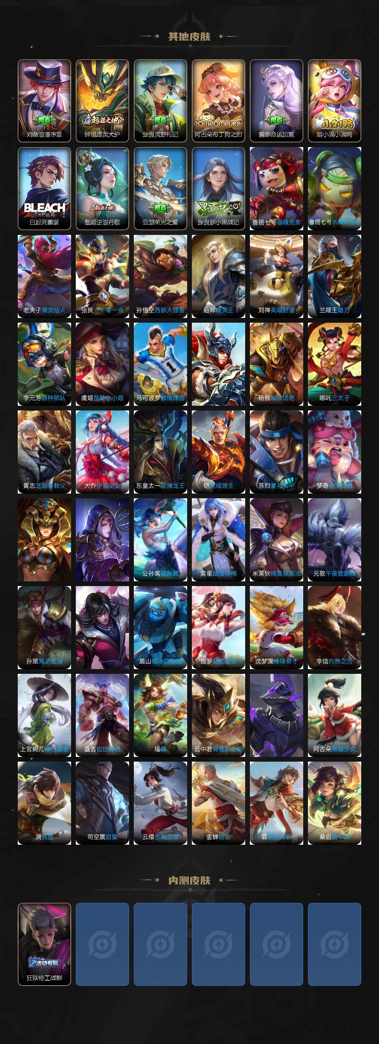 李元芳逐浪之夏,大乔猫狗日记,孙策猫狗日记,阿轲节奏热浪,露娜紫霞仙子,诸葛亮黄金分割率,王昭君偶像歌手,项羽苍穹之光,吕布末日机甲,橘右京修罗,嬴政摇滚巨星,刘禅绅士熊喵,刘禅天才门将,程咬金功夫厨神,兰陵王暗隐猎兽者,曹操幽灵船长,宫本武藏鬼剑武藏,亚瑟心灵战警,杨戬天秀·启明,廉颇地狱岩魂,小乔缤纷独角兽,夏侯惇乘风破浪,花木兰水晶猎龙者,百里玄策热力回旋,墨子金属风暴,貂蝉圣诞恋歌,百里守约特工魅影,嬴政暗夜贵公子,嫦娥拒霜思,李白千年之狐,夏洛特永昼,澜赏金猎手,镜玫瑰异探,刘备百相守梦,蒙犽百解令,高渐离燃音魔法,赵怀真器灵·浮梦炉