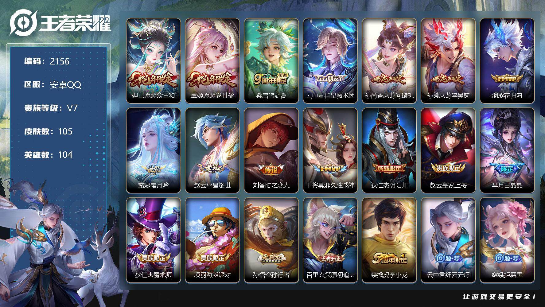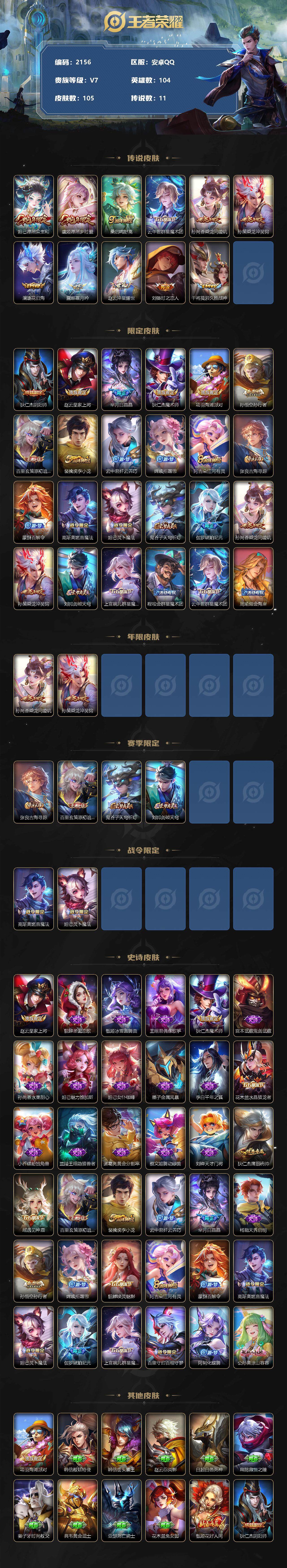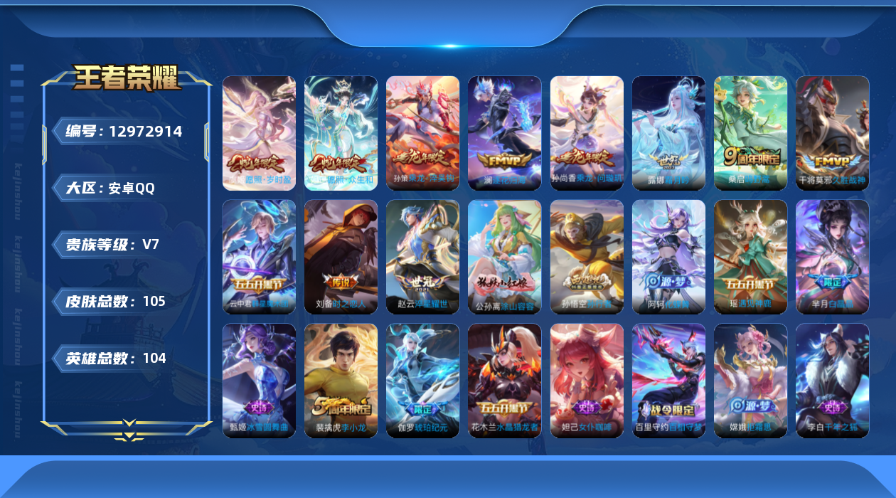 [12972914]安卓Q-V1-尊贵铂金IV段位-104英雄-105皮肤-0典藏-0珍品无双-0无双-0珍品传说-11传说-35史诗