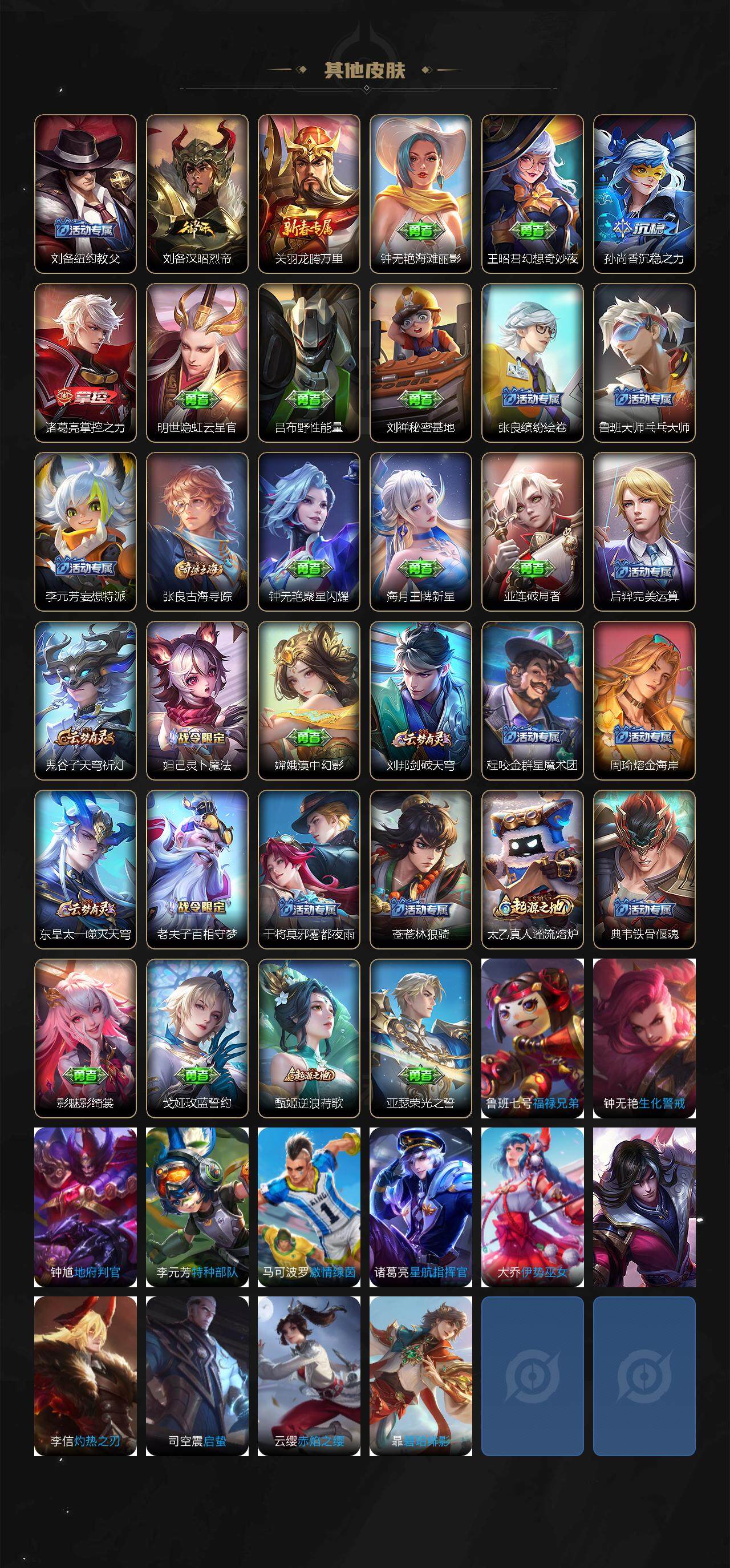 【其他皮肤】:项羽海滩派对,韩信教廷特使,韩信街头霸王,赵云忍炎影,白起白色死神,扁鹊救世之瞳,姜子牙时尚教父,典韦黄金武士,亚瑟死亡骑士,花木兰兔女郎,甄姬花好人间,狄仁杰阴阳师,刘备纽约教父,刘备汉昭烈帝,关羽龙腾万里,钟无艳海滩丽影,王昭君幻想奇妙夜,孙尚香沉稳之力,诸葛亮掌控之力,明世隐虹云星官,吕布野性能量,刘禅秘密基地,张良缤纷绘卷,鲁班大师乓乓大师,李元芳妄想特派,张良古海寻踪,钟无艳聚星闪耀,海月王牌新星,亚连破局者,后羿完美运算,鬼谷子天穹祈灯,妲己灵卜魔法,嫦娥漠中幻影,刘邦剑破天穹,程咬金群星魔术团,周瑜熔金海岸,东皇太一噬灭天穹,老夫子百相