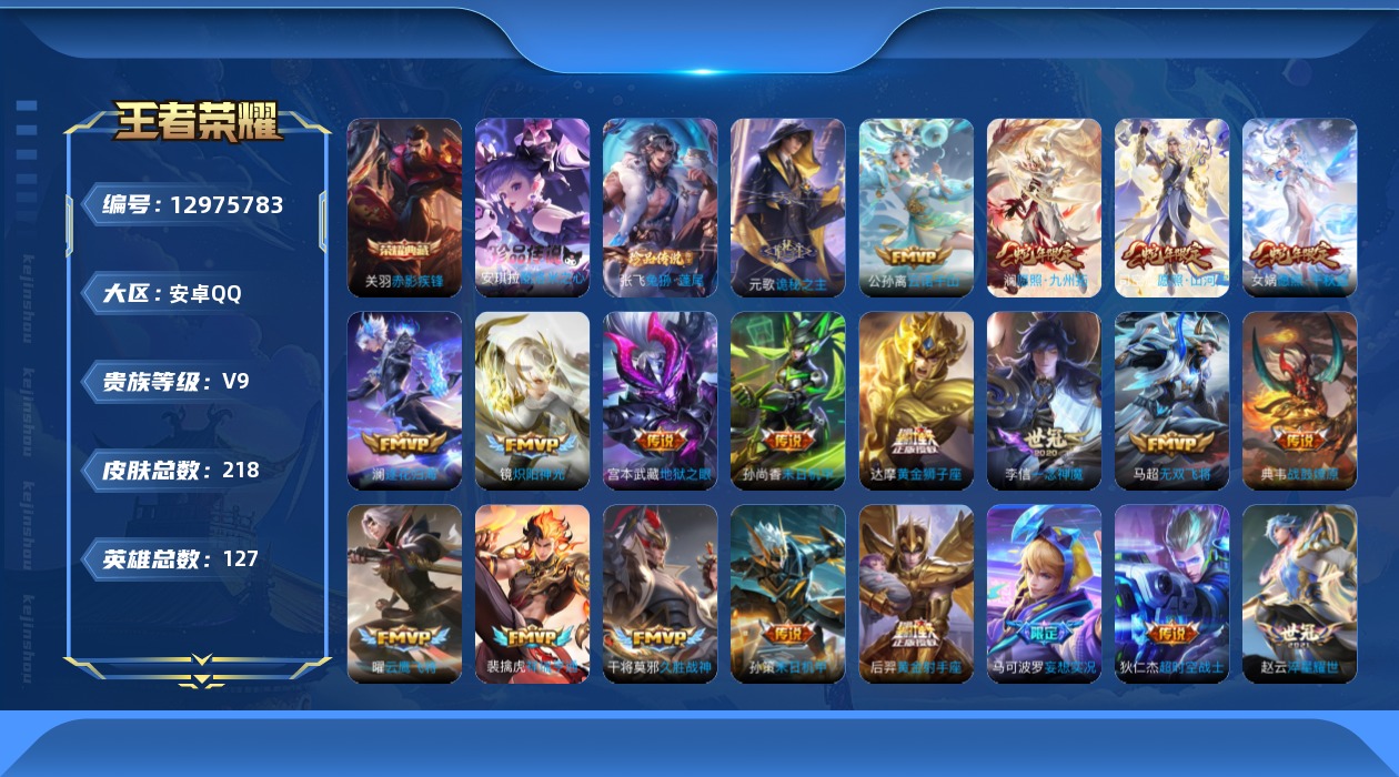 [12975783]安卓Q-V9-最强王者段位-126英雄-218皮肤-1典藏-0珍品无双-0无双-2珍品传说-27传说-69史诗