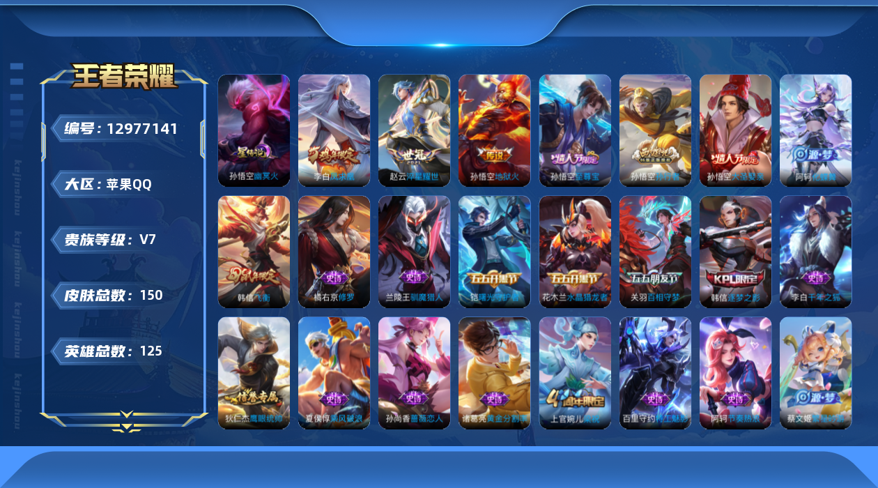[12977141]苹果Q-V7-永恒钻石V段位-125英雄-150皮肤-1星元-4传说-36史诗 【传说皮肤】:后羿神树通天,赵云淬星耀世,李白凤求凰,孙悟空地狱火 【限定皮肤】:狄仁杰阴阳师,赵云皇家上将,孙尚香蔷薇恋人,鲁班七号狮舞东方,扁鹊奇幻香踪,周瑜赤莲之焰,夏侯惇朔风刀,典韦穷奇,狄仁杰魔术师,狄仁杰万华元夜,项羽海滩派对,项羽霸王别姬,老夫子醍醐杖,关羽百相守梦,程咬金演武夺筹,韩信逐梦之影,韩信飞衡,兰陵王驯魔猎人,孙悟空美猴王,孙悟空至尊宝,孙悟空大圣娶亲,孙悟空孙行者,牛魔御旌,李元芳银河之约,李元芳云中旅人,钟馗神迹守卫,钟馗驱傩正仪,杨戬潮玩骑兵,蔡文姬繁星吟游,鬼谷子原初探秘者,苏烈千军破阵,弈星混沌棋,沈梦溪星空之诺,明世隐疑决卦,裴擒虎擒涛扼浪,狂铁御狮,米莱狄御霄,盾山御銮,上官婉儿梁祝,鲁班大师探海日志,桑启海盐诗旅,张良古海寻踪,鬼谷子天穹祈灯,刘邦剑破天穹 【年限皮肤】:孙悟空美猴王,李白凤求凰,韩信飞衡 【赛季限定】:夏侯惇朔风刀,典韦穷奇,狄仁杰万华元夜,老夫子醍醐杖,程咬金演武夺筹,张良古海寻踪,牛魔御旌,李元芳云中旅人,钟馗驱傩正仪,鬼谷子原初探秘者,苏烈千军破阵,弈星混沌棋,明世隐疑决卦,裴擒虎擒涛扼浪,狂铁御狮,米莱狄御霄,盾山御銮,鲁班大师探海日志,桑启海盐诗旅,鬼谷子天穹祈灯,刘邦剑破天穹 【战令限定】:鲁班七号狮舞东方,扁鹊奇幻香踪,周瑜赤莲之焰,兰陵王驯魔猎人,李元芳银河之约,钟馗神迹守卫,杨戬潮玩骑兵,沈梦溪星空之诺 【史诗皮肤】:项羽苍穹之光,赵云皇家上将,王昭君偶像歌手,狄仁杰魔术师,宫本武藏鬼剑武藏,孙尚香蔷薇恋人,孙尚香水果甜心,嬴政摇滚巨星,妲己魅力维加斯,吕布圣诞狂欢,李白千年之狐,韩信白龙吟,项羽霸王别姬,孙悟空至尊宝,花木兰水晶猎龙者,刘邦德古拉伯爵,韩信逐梦之影,夏侯惇乘风破浪,诸葛亮黄金分割率,百里守约特工魅影,铠曙光守护者,阿轲节奏热浪,孙悟空大圣娶亲,伽罗箭羽风息,鲁班七号狮舞东方,狄仁杰鹰眼统帅,兰陵王驯魔猎人,上官婉儿梁祝,蔡文姬繁星吟游,李元芳银河之约,韩信飞衡,橘右京修罗,孙悟空孙行者,扁鹊奇幻香踪,关羽百相守梦,阿轲化蝶舞 【其他皮肤】:项羽海滩派对,韩信教廷特使,韩信街头霸王,露娜哥特玫瑰,阿轲爱心护理,达摩大发明家,赵云忍炎影,白起白色死神,牛魔西部大镖客,扁鹊化身博士,扁鹊救世之瞳,