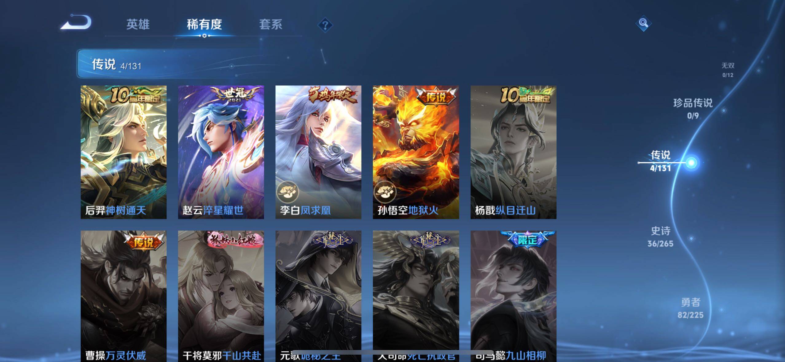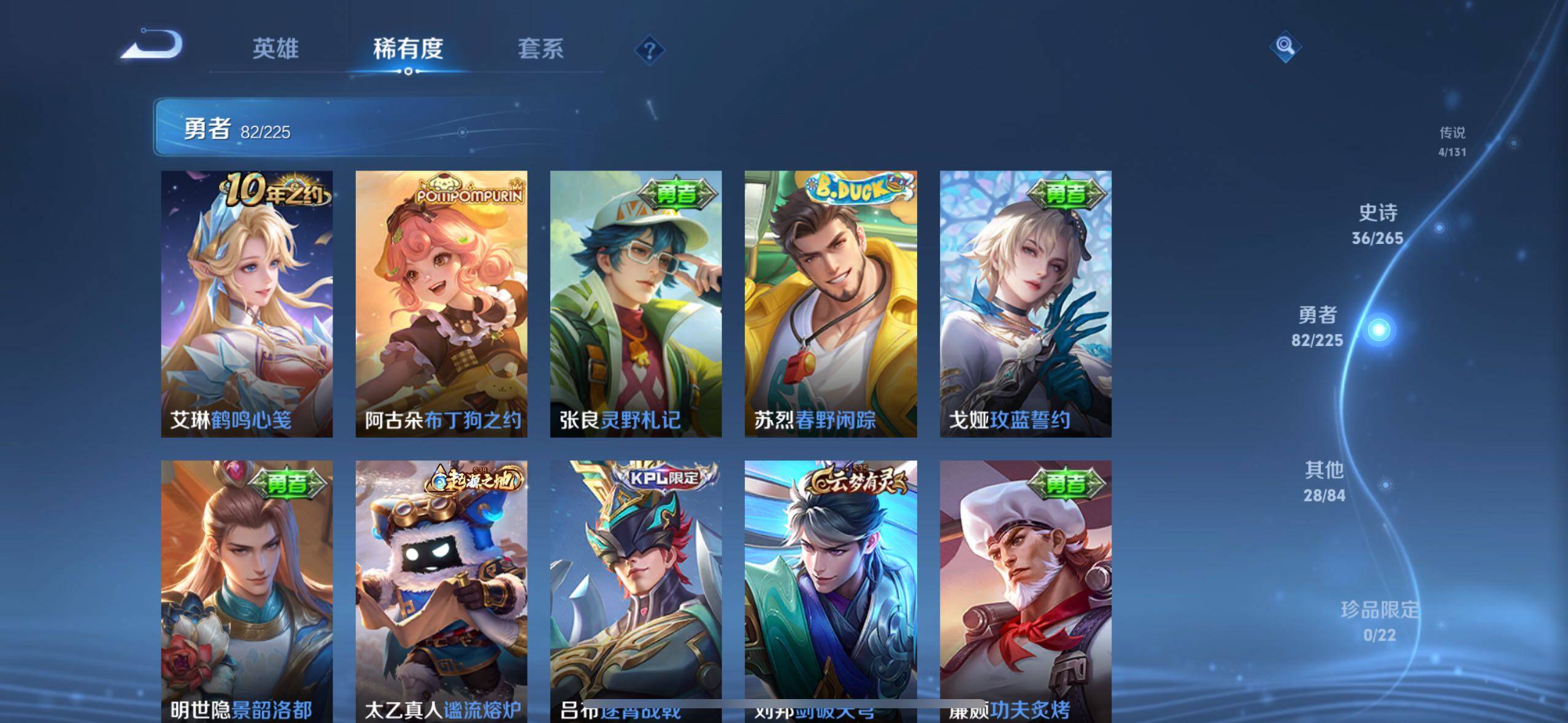 【限定皮肤】:狄仁杰阴阳师,赵云皇家上将,孙尚香蔷薇恋人,鲁班七号狮舞东方,扁鹊奇幻香踪,周瑜赤莲之焰,夏侯惇朔风刀,典韦穷奇,狄仁杰魔术师,狄仁杰万华元夜,项羽海滩派对,项羽霸王别姬,老夫子醍醐杖,关羽百相守梦,程咬金演武夺筹,韩信逐梦之影,韩信飞衡,兰陵王驯魔猎人,孙悟空美猴王,孙悟空至尊宝,孙悟空大圣娶亲,孙悟空孙行者,牛魔御旌,李元芳银河之约,李元芳云中旅人,钟馗神迹守卫,钟馗驱傩正仪,杨戬潮玩骑兵,蔡文姬繁星吟游,鬼谷子原初探秘者,苏烈千军破阵,弈星混沌棋,沈梦溪星空之诺,明世隐疑决卦,裴擒虎擒涛扼浪,狂铁御狮,米莱狄御霄,盾山御銮,上官婉儿梁祝,鲁班大师探海日志,桑启海盐诗旅,张良古海寻踪,鬼谷子天穹祈灯,刘邦剑破天穹