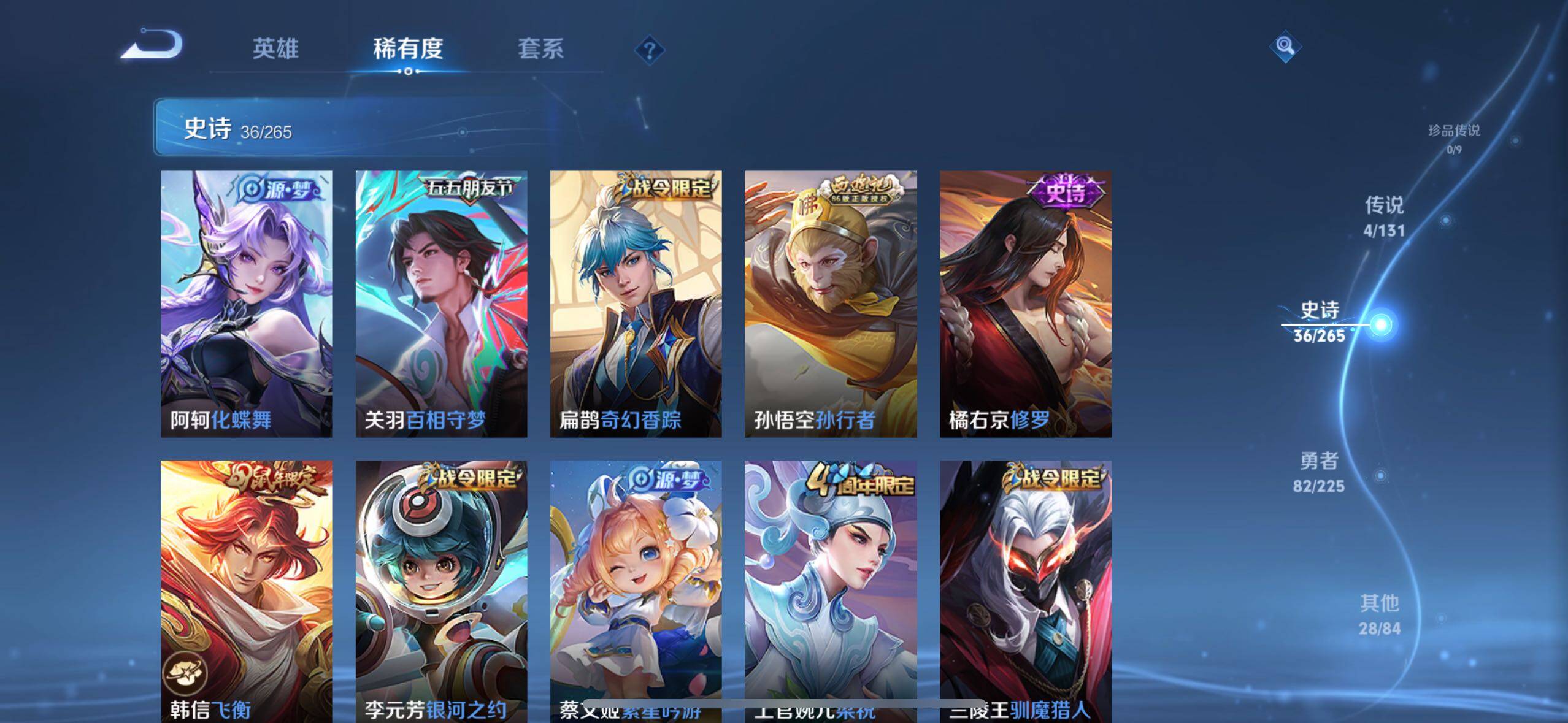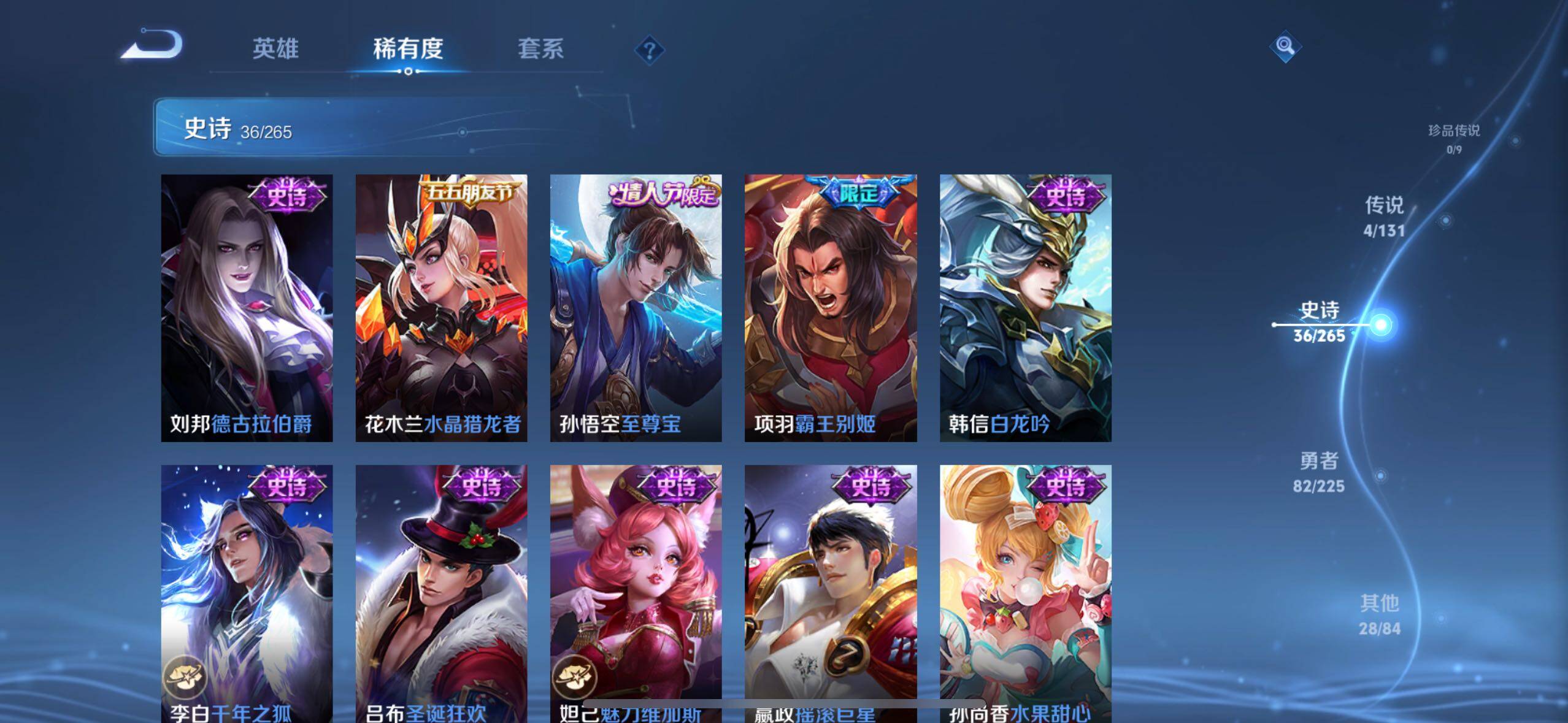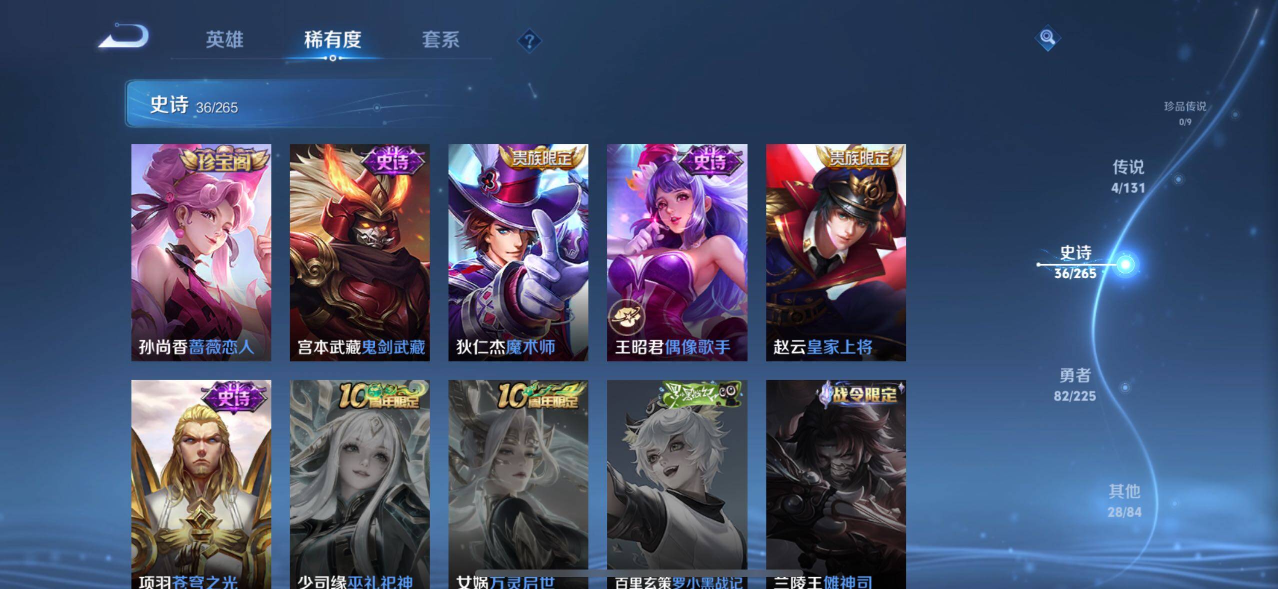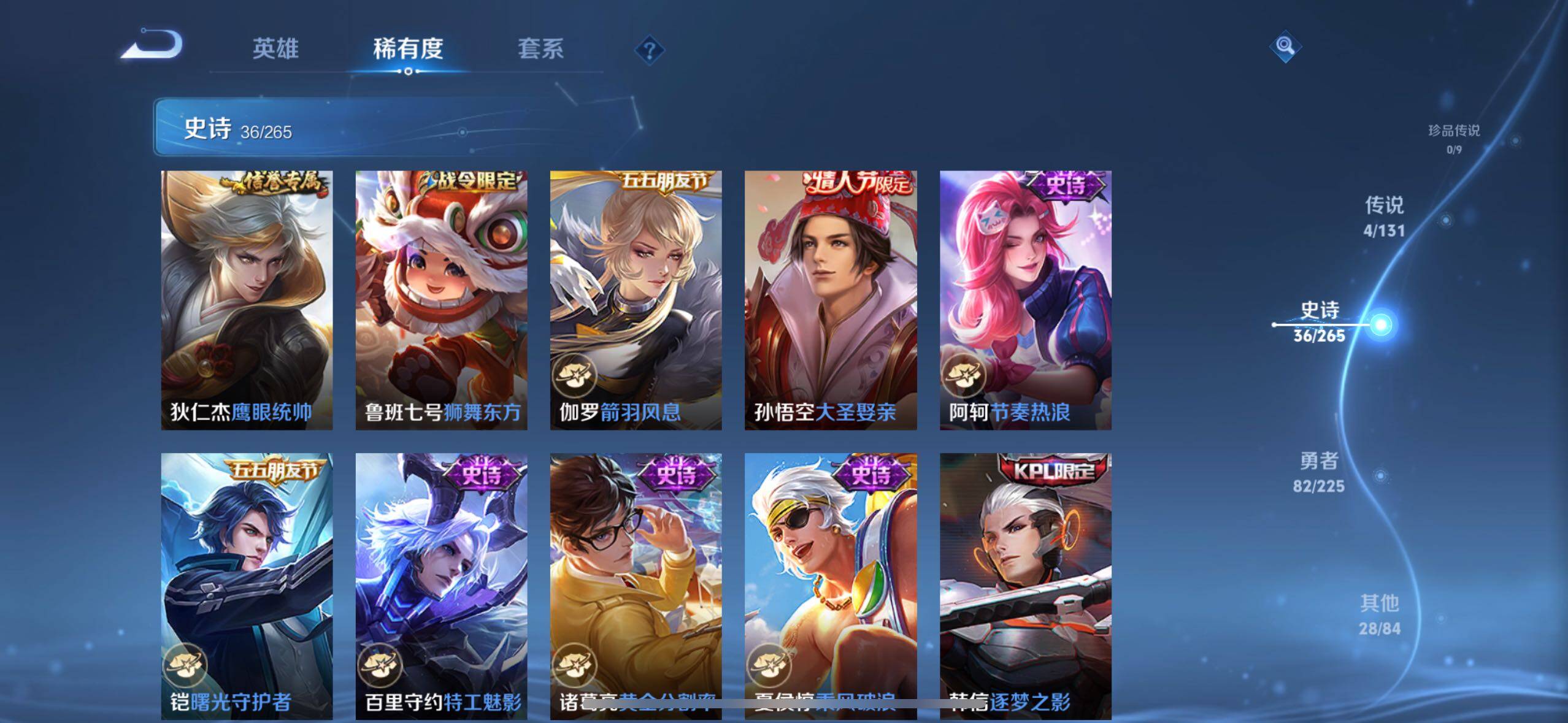 【史诗皮肤】:项羽苍穹之光,赵云皇家上将,王昭君偶像歌手,狄仁杰魔术师,宫本武藏鬼剑武藏,孙尚香蔷薇恋人,孙尚香水果甜心,嬴政摇滚巨星,妲己魅力维加斯,吕布圣诞狂欢,李白千年之狐,韩信白龙吟,项羽霸王别姬,孙悟空至尊宝,花木兰水晶猎龙者,刘邦德古拉伯爵,韩信逐梦之影,夏侯惇乘风破浪,诸葛亮黄金分割率,百里守约特工魅影,铠曙光守护者,阿轲节奏热浪,孙悟空大圣娶亲,伽罗箭羽风息,鲁班七号狮舞东方,狄仁杰鹰眼统帅,兰陵王驯魔猎人,上官婉儿梁祝,蔡文姬繁星吟游,李元芳银河之约,韩信飞衡,橘右京修罗,孙悟空孙行者,扁鹊奇幻香踪,关羽百相守梦,阿轲化蝶舞
