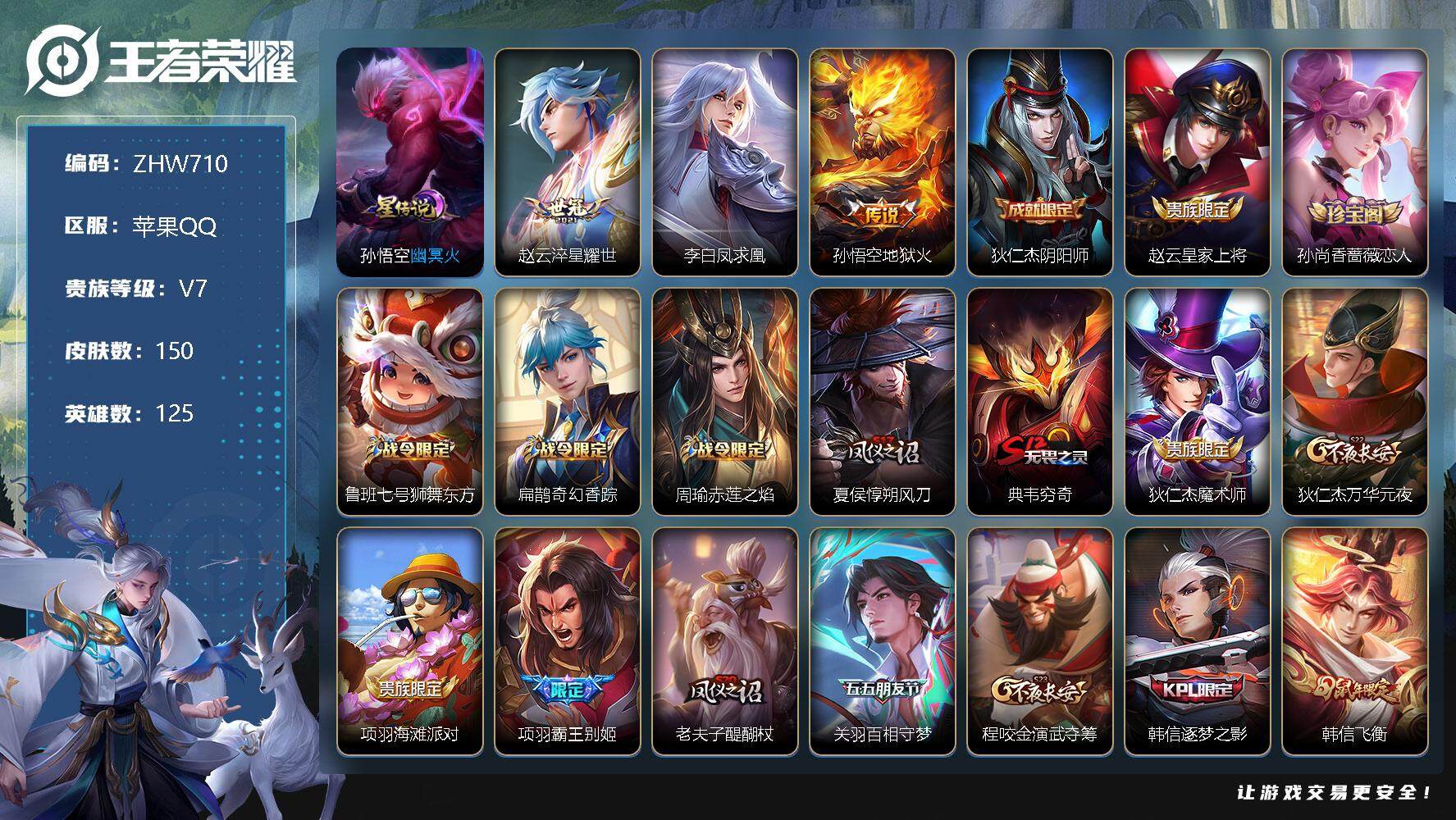 - [12297571]V7 2典藏 3珍品传说 8传说 125英雄 341皮肤 可修改实名 优质装备:鸣剑·曳影,弑枪猎影(韩信典藏),怪盗基德,一念神魔,胖达荣荣,涂山容容 珍品传说:时之奇旅-孙策,兔狲·蓬尾 传说皮:落雪白狼,死亡执政官,幻光神枪 珍宝阁皮:妄想食味,蔷薇恋人 限定皮:愿照·岁时盈(虞姬年限),逐霄战戟,鸣野蒿,白鹤梁神女,遇见飞天,五谷丰年,梁祝,李小龙,永曜之星,圣诞老人,孙行者,百木心枪,玉兔公主,天降福星 史诗皮:鸭鸭历险记-刘禅,器灵·浮梦炉,化蝶舞,星界战将,谪仙醉月,龙之律动,雪豹·霜爪,石田雨龙,百相守梦-周瑜,茶境仙,破空之剑,战舞者,东方月初,蒙犽顽岩魄,琥珀纪元伽罗,蔬乡物语(鲁班七号),百相守梦-百里守约,百相守梦-黄忠,织梦人,紫霞仙子,特工魅影,江河有灵,雪夜绮愿(周瑜),魅语,百解令(蒙犽),高渐离燃音魔法,蒙恬荣光圣徽,偶像歌手,白蛇,电玩·爆裂旋风,末日机甲-吕布,猫狗日记-孙策,乱世虎臣,节奏热浪,女仆咖啡,摇滚巨星,水果甜心,天才门将,星夜王子,心灵骇客,功夫厨神,德古拉伯爵,暗隐猎兽者,幽灵船长,鬼剑武藏,心灵战警,乐园奇幻夜,舞动绿茵,地狱岩魂,纤云弄巧,拒霜思,缤纷独角兽,乘风破浪,逐浪之夏,水晶猎龙者,曙光守护者,金属风暴,原初追逐者,圣诞狂欢,圣诞恋歌,鹰眼统帅,王者之锤,魅力维加斯,未来纪元-赵云