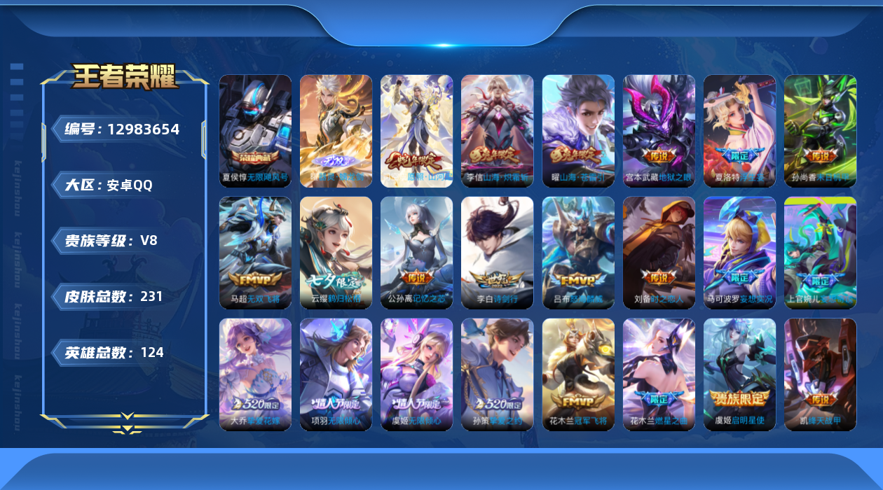 [12983654]安卓Q-V8-永恒钻石IV段位-124英雄-231皮肤-1典藏-0珍品无双-1无双-0珍品传说-23传说-56史诗
