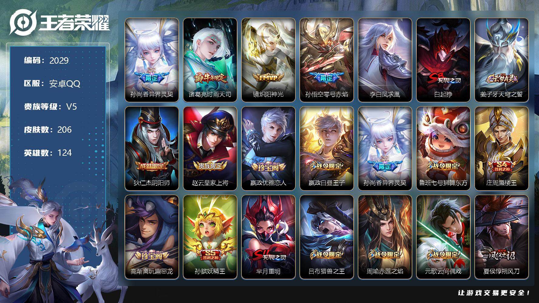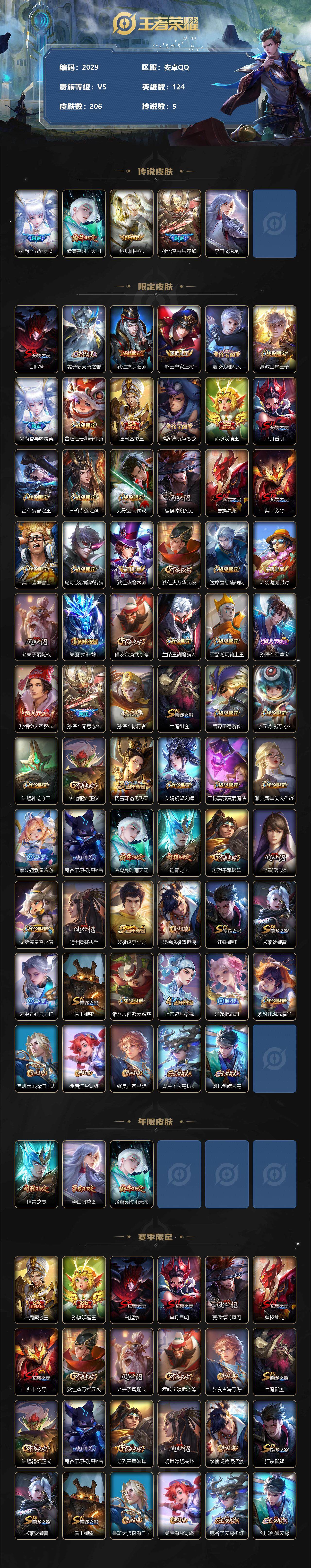 [12991724]安卓Q-V5-永恒钻石III段位-124英雄-206皮肤-0典藏-0珍品无双-0无双-0珍品传说-5传说-50史诗