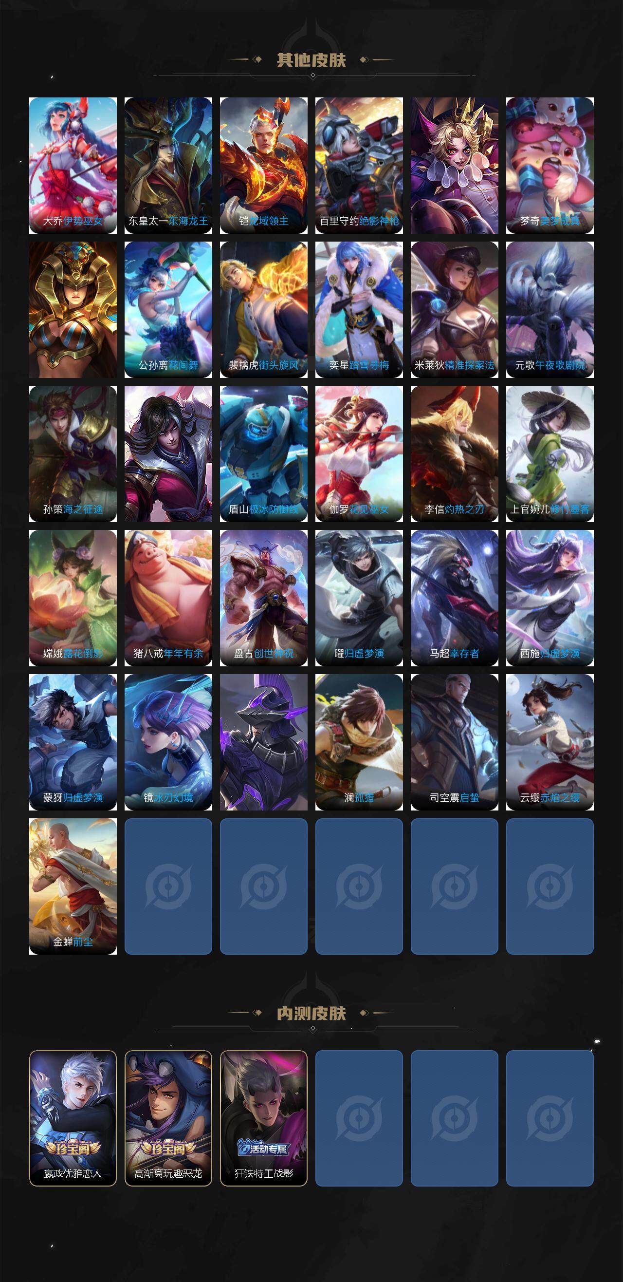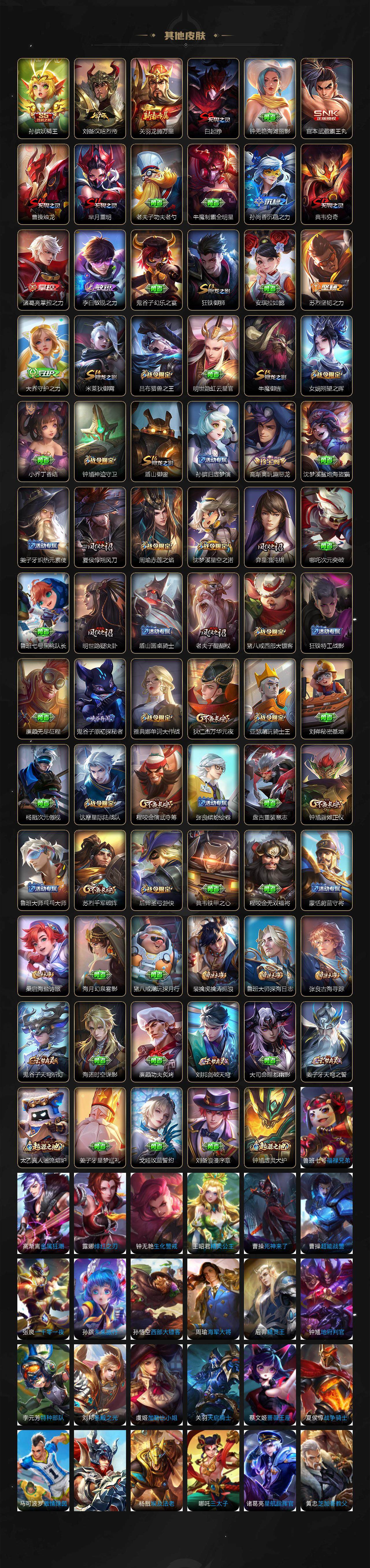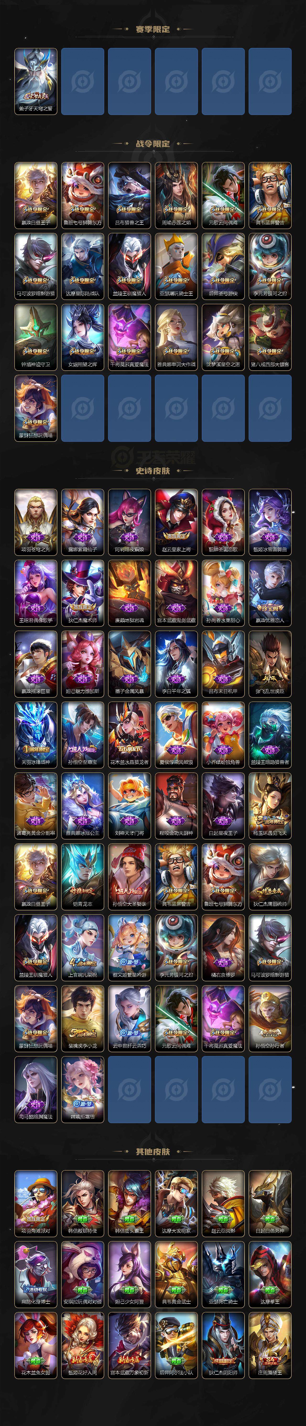 【限定皮肤】:白起狰,姜子牙天穹之誓,狄仁杰阴阳师,赵云皇家上将,嬴政优雅恋人,嬴政白昼王子,孙尚香异界灵契,鲁班七号狮舞东方,庄周蜃楼王,高渐离玩趣恶龙,孙膑妖精王,芈月重明,吕布猎兽之王,周瑜赤莲之焰,元歌云间偶戏,夏侯惇朔风刀,曹操烛龙,典韦穷奇,典韦蓝屏警告,马可波罗暗影游猎,狄仁杰魔术师,狄仁杰万华元夜,达摩星际陆战队,项羽海滩派对,老夫子醍醐杖,关羽冰锋战神,程咬金演武夺筹,兰陵王驯魔猎人,亚瑟潮玩骑士王,孙悟空至尊宝,孙悟空大圣娶亲,孙悟空零号赤焰,孙悟空孙行者,牛魔御旌,后羿圣弓游侠,李元芳银河之约,钟馗神迹守卫,钟馗驱傩正仪,杨玉环遇见飞天,女娲朔望之晖,干将莫邪真爱魔法,雅典娜单词大作战,蔡文姬繁星吟游,鬼谷子原初探秘者,诸葛亮时雨天司,铠青龙志,苏烈千军破阵,弈星混沌棋,沈梦溪星空之诺,明世隐疑决卦,裴擒虎李小龙,裴擒虎擒涛扼浪,狂铁御狮,米莱狄御霄,云中君纤云弄巧,盾山御銮,猪八戒西部大镖客,上官婉儿梁祝,嫦娥拒霜思,蒙犽狂想玩偶喵,鲁班大师探海日志,桑启海盐诗旅,张良古海寻踪,鬼谷子天穹祈灯,刘邦剑破天穹