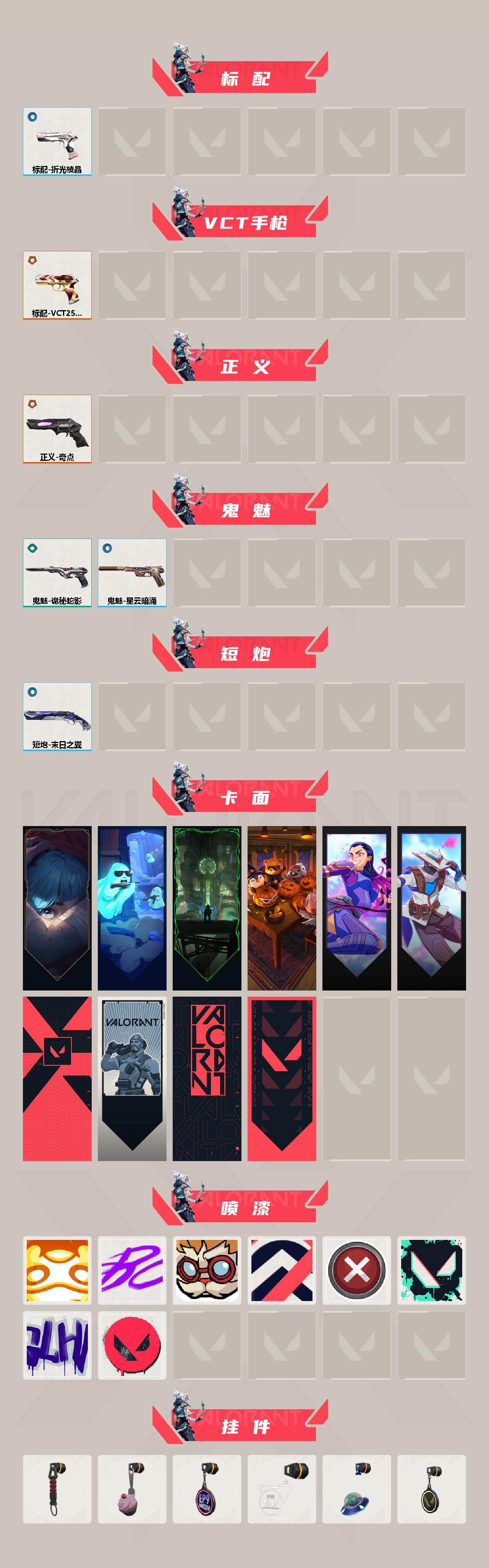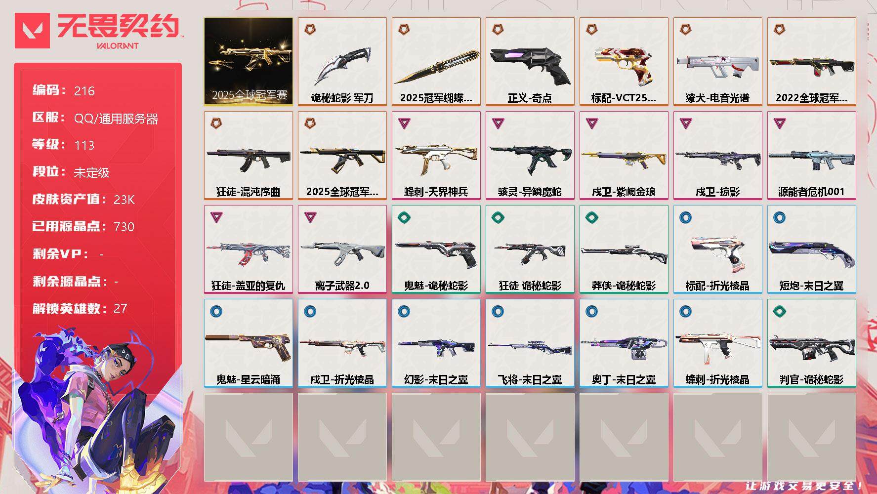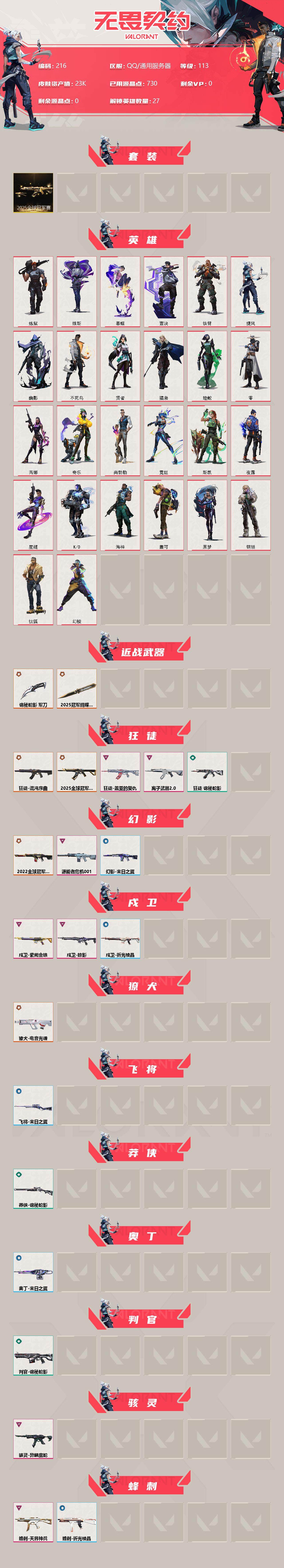 [12992763]【套装】:2025全球冠军赛套装 【英雄】:幻棱,炼狱,维斯,暮蝶,钛狐,壹决,铁臂,捷风,幽影,不死鸟,贤者,猎枭,蝰蛇,零,芮娜,奇乐,尚勃勒,霓虹,斯凯,夜露,星礈,K/O,海神,盖可,黑梦,钢锁 【近战 武器】:近战武器-2025全球冠军赛 蝴蝶刀,近战武器-诡秘蛇影 军刀 【狂徒】:狂徒-2025全球冠军赛,狂徒-混沌序曲,狂徒-盖亚的复仇,狂徒-离子武器//2.0,狂徒-诡秘蛇影 【幻影】:幻影-2022全球冠军赛,幻影-源能者危机001,幻影-末日之翼 【戍卫】:戍卫-掠影,戍卫-紫阙金琅,戍卫-折光棱晶 【獠犬】:獠犬-电音光谱,獠犬-电音光谱 【飞将】:飞将-末日之翼 【莽侠】:莽侠-诡秘蛇影 【奥丁】:奥丁-末日之翼 【判官】:判官-诡秘蛇影 【骇灵】:骇灵-异鳞魔蛇 【蜂刺】:蜂刺-天界神兵,蜂刺-折光棱晶 【标配】:标配-折光棱晶 【VCT手枪】:标配-VCT25 x EDG 【正义】:正义-奇点 【鬼魅】:鬼魅-诡秘蛇影,鬼魅-星云暗涌 【短炮】:短炮-末日之翼 【卡面】:《双城之战》拥抱 卡面,精灵大战 卡面,欢迎来到底城 卡面,南瓜盛典 卡面,无畏契约GO!第一卷:芮娜 卡面,无畏契约GO!第一卷:零 卡面,代号红色 卡面,新兵报到 卡面,V契约 卡面,无畏契约 卡面 【喷漆】:嗨宝南瓜灯 喷漆,嘭! 喷漆,都算到了 喷漆,控场勿近 喷漆,买装还是存钱 喷漆,胜利属于无畏契约 喷漆,GLHF 喷漆,无畏契约 喷漆 【挂饰】:伞绳 挂饰,《双城之战》小蛋糕 挂饰,第九季//第三幕 纪念币 挂饰,VCT x EDG 挂饰,天外飞客 挂饰,无畏契约 纪念币 挂饰