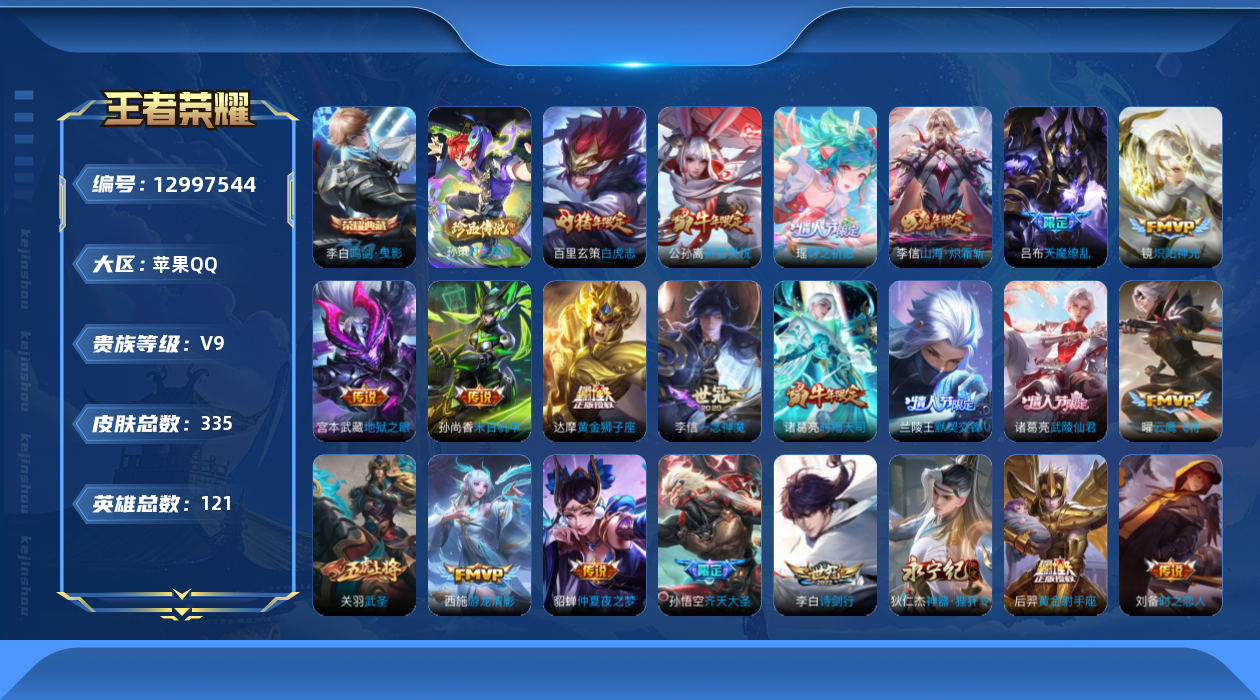 [12997544]苹果Q-V9-荣耀黄金II段位-121英雄-335皮肤-1典藏-0珍品无双-0无双-1珍品传说-34传说-101史诗