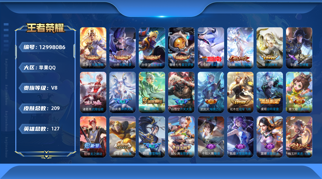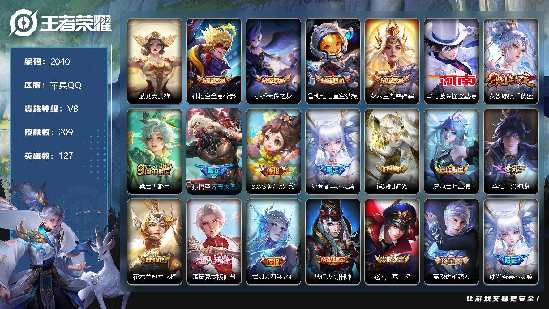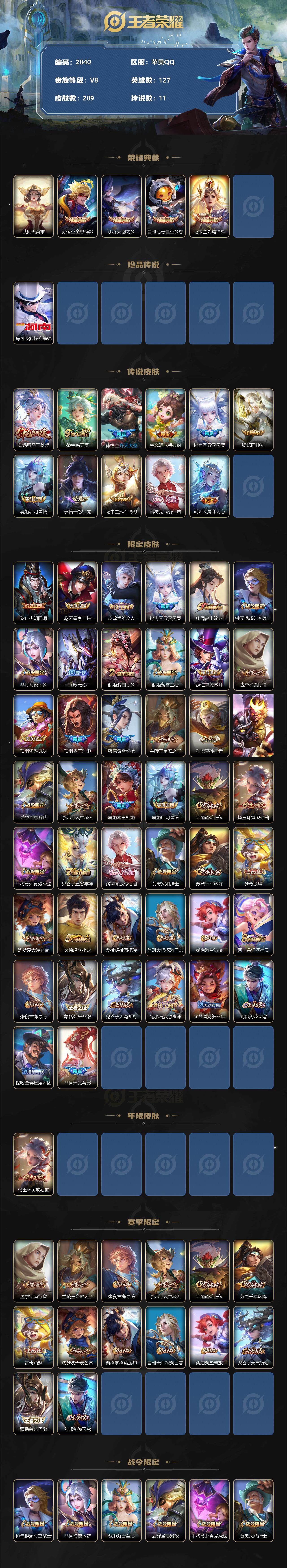 [12998086]苹果Q-V8-永恒钻石II段位-127英雄-209皮肤-4典藏-0珍品无双-0无双-1珍品传说-11传说-69史诗