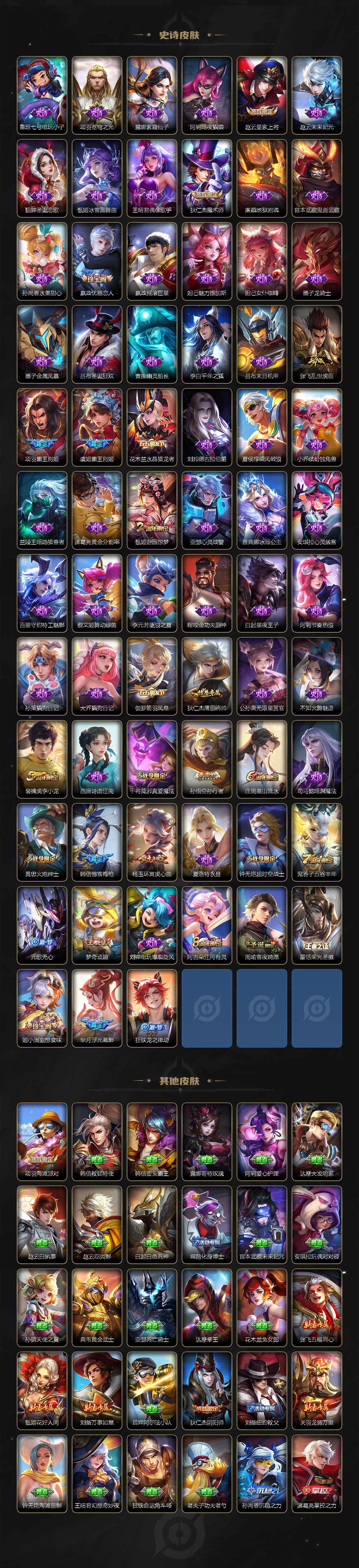 【史诗皮肤】:鲁班七号电玩小子,项羽苍穹之光,露娜紫霞仙子,阿轲暗夜猫娘,赵云皇家上将,赵云未来纪元,貂蝉圣诞恋歌,甄姬冰雪圆舞曲,王昭君偶像歌手,狄仁杰魔术师,廉颇地狱岩魂,宫本武藏鬼剑武藏,孙尚香水果甜心,嬴政优雅恋人,嬴政摇滚巨星,妲己魅力维加斯,妲己女仆咖啡,墨子龙骑士,墨子金属风暴,吕布圣诞狂欢,曹操幽灵船长,李白千年之狐,吕布末日机甲,张飞乱世虎臣,项羽霸王别姬,虞姬霸王别姬,花木兰水晶猎龙者,刘邦德古拉伯爵,夏侯惇乘风破浪,小乔缤纷独角兽,兰陵王暗隐猎兽者,诸葛亮黄金分割率,甄姬游园惊梦,亚瑟心灵战警,雅典娜冰冠公主,安琪拉心灵骇客,百里守约