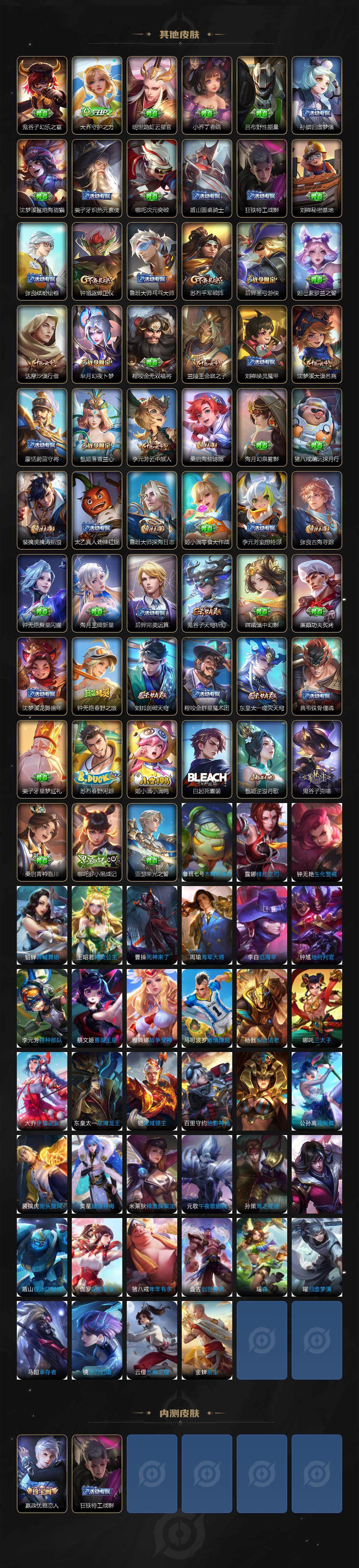 伽罗箭羽风息,李元芳逐浪之夏,不知火舞魅语,公孙离无限星赏官,大乔猫狗日记,孙策猫狗日记,阿轲节奏热浪,露娜紫霞仙子,诸葛亮黄金分割率,王昭君偶像歌手,项羽苍穹之光,阿轲暗夜猫娘,雅典娜冰冠公主,吕布末日机甲,鲁班七号电玩小子,墨子龙骑士,嬴政摇滚巨星,白起星夜王子,安琪拉心灵骇客,程咬金功夫厨神,刘邦德古拉伯爵,兰陵王暗隐猎兽者,曹操幽灵船长,宫本武藏鬼剑武藏,司马懿暗渊魔法,亚瑟心灵战警,蔡文姬舞动绿茵,廉颇地狱岩魂,西施诗语江南,小乔缤纷独角兽,夏侯惇乘风破浪,花木兰水晶猎龙者,墨子金属风暴,吕布圣诞狂欢,貂蝉圣诞恋歌,百里守约特工魅影,李白千年之狐,夏洛特永昼,刘禅电玩·爆裂旋风,周瑜雪夜绮愿