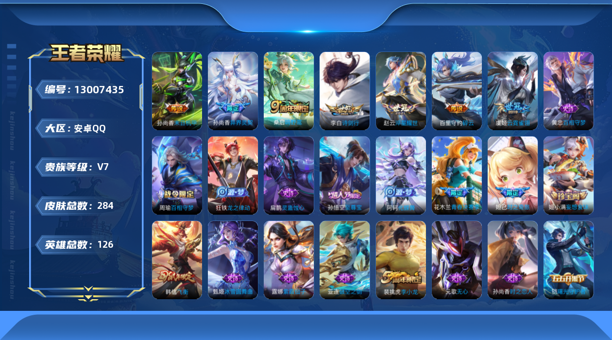 [13007435]安卓Q-V7-至尊星耀III段位-126英雄-284皮肤-0典藏-0珍品无双-0无双-0珍品传说-7传说-70史诗