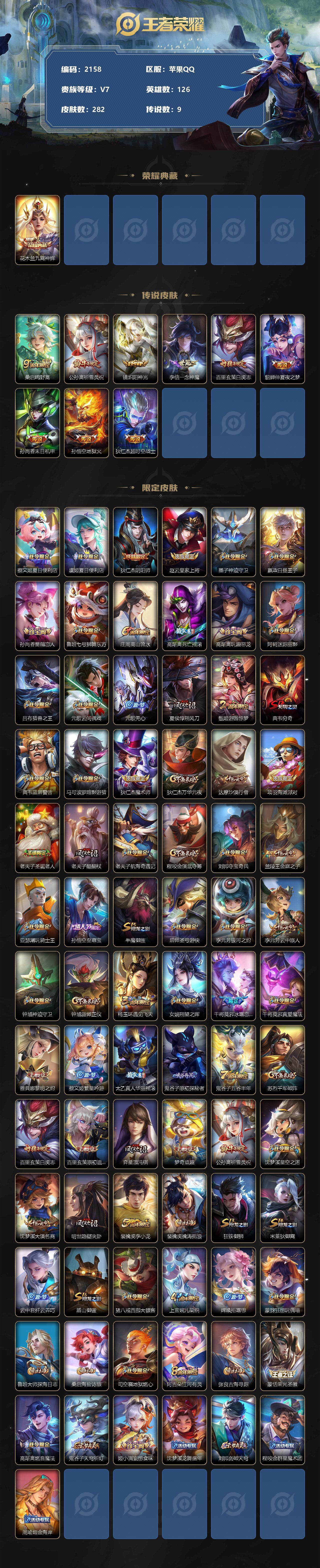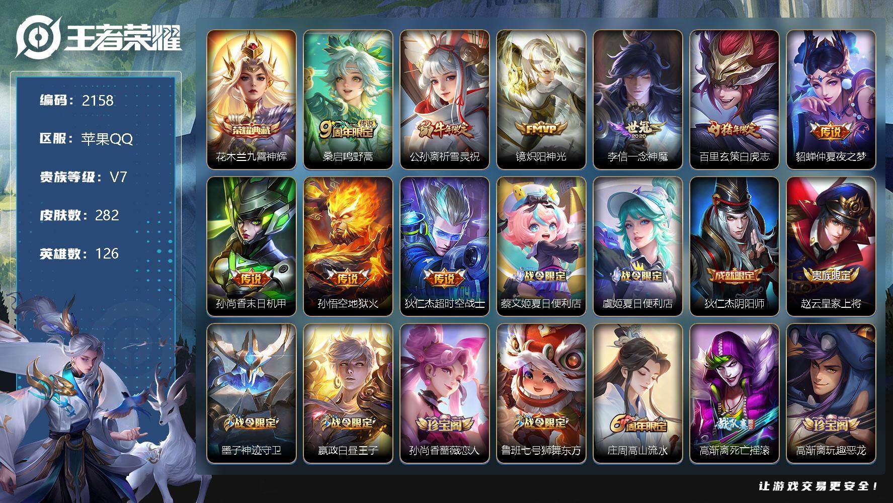 [13009147]苹果Q-V7-最强王者段位-126英雄-282皮肤-1典藏-0珍品无双-0无双-0珍品传说-9传说-82史诗