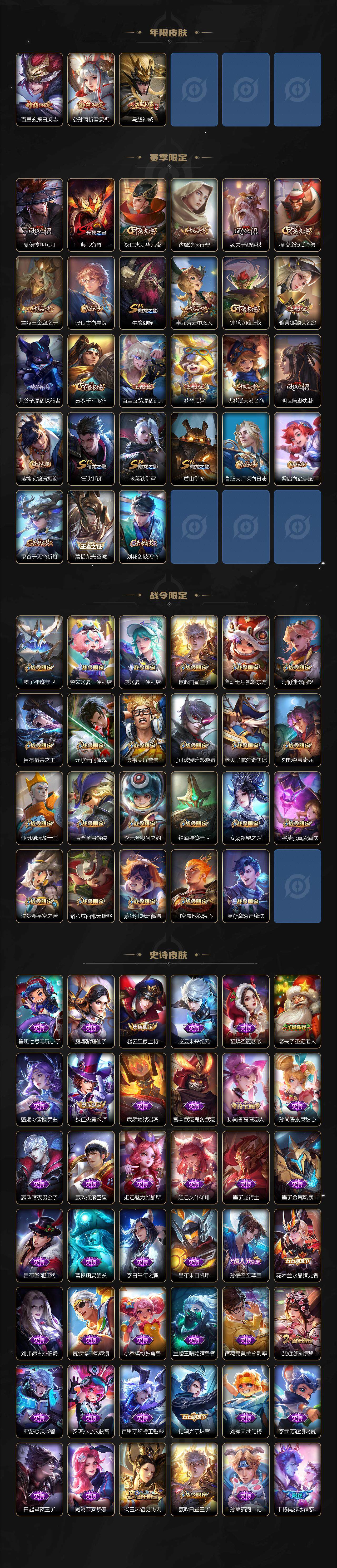【赛季限定】:夏侯惇朔风刀,典韦穷奇,狄仁杰万华元夜,达摩沙漠行僧,老夫子醍醐杖,程咬金演武夺筹,兰陵王金庭之子,张良古海寻踪,牛魔御旌,李元芳云中旅人,钟馗驱傩正仪,雅典娜黎明之约,鬼谷子原初探秘者,苏烈千军破阵,百里玄策原初追逐者,弈星混沌棋,梦奇顽趣,沈梦溪大漠名商,明世隐疑决卦,裴擒虎擒涛扼浪,狂铁御狮,米莱狄御霄,盾山御銮,鲁班大师探海日志,桑启海盐诗旅,鬼谷子天穹祈灯,蒙恬荣光圣徽,刘邦