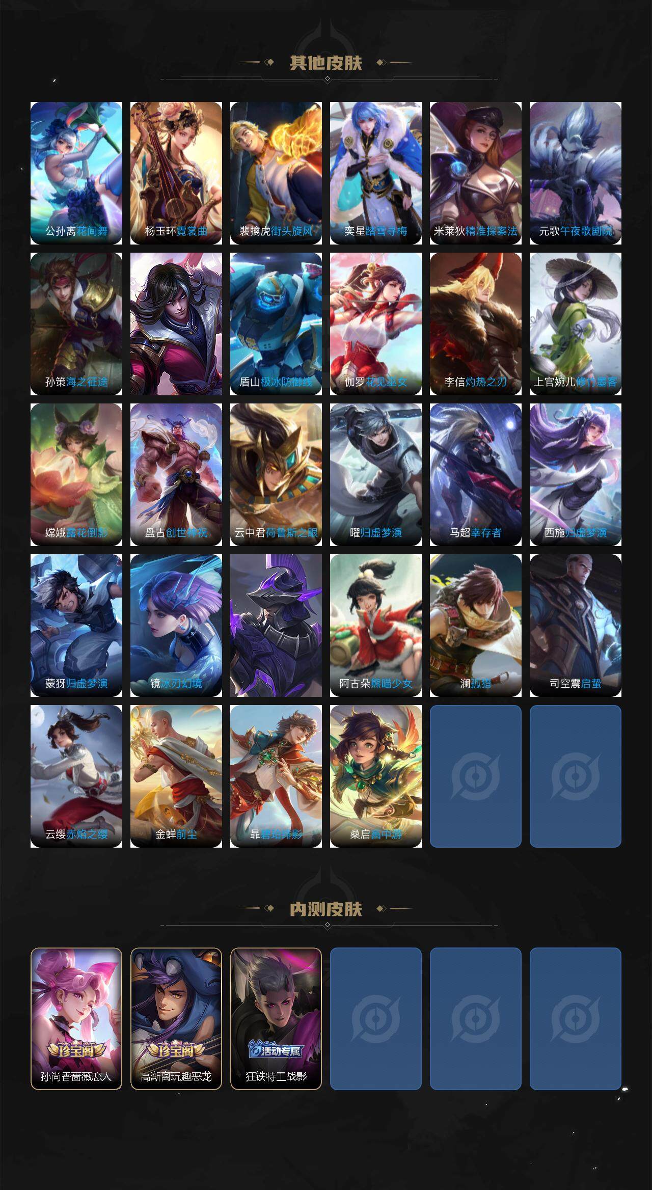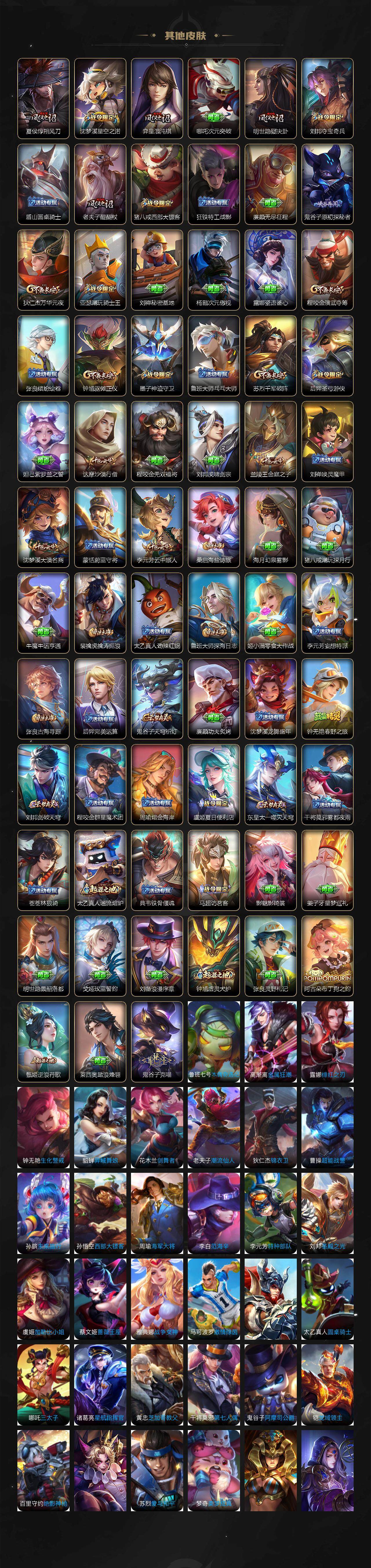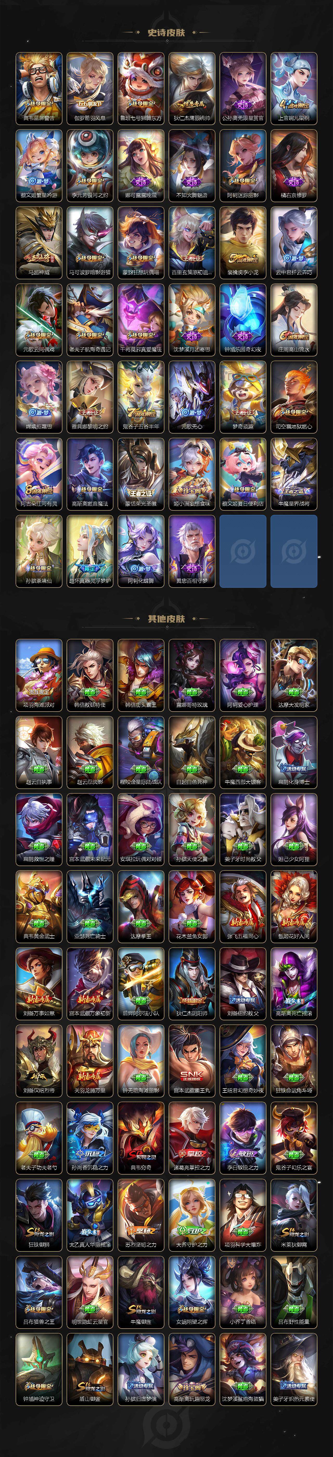 娜可露露晚萤,伽罗箭羽风息,李元芳逐浪之夏,不知火舞魅语,公孙离无限星赏官,孙策猫狗日记,阿轲节奏热浪,露娜紫霞仙子,诸葛亮黄金分割率,吕布末日机甲,鲁班七号电玩小子,橘右京修罗,墨子龙骑士,嬴政摇滚巨星,刘禅天才门将,白起星夜王子,安琪拉心灵骇客,刘邦德古拉伯爵,兰陵王暗隐猎兽者,曹操幽灵船长,宫本武藏鬼剑武藏,亚瑟心灵战警,钟馗乐园奇幻夜,廉颇地狱岩魂,小乔缤纷独角兽,夏侯惇乘风破浪,花木兰水晶猎龙者,铠曙光守护者,墨子金属风暴,百里玄策原初追逐者,吕布圣诞狂欢,貂蝉圣诞恋歌,百里守约特工魅影,嬴政暗夜贵公子,嫦娥拒霜思,雅典娜黎明之约,李白千年之狐,高渐离燃音魔法,赵怀真器灵·浮梦炉