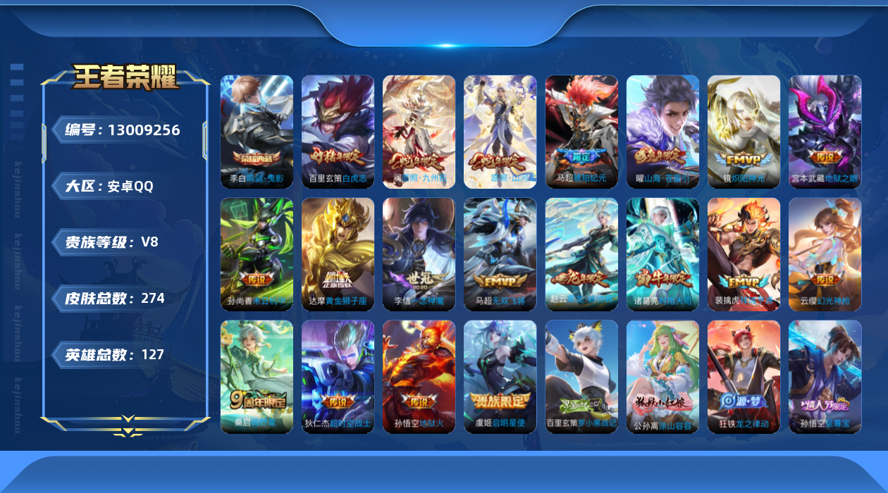 [13009256]安卓Q-V8-最强王者段位-127英雄-274皮肤-1典藏-0珍品无双-0无双-0珍品传说-19传说-79史诗