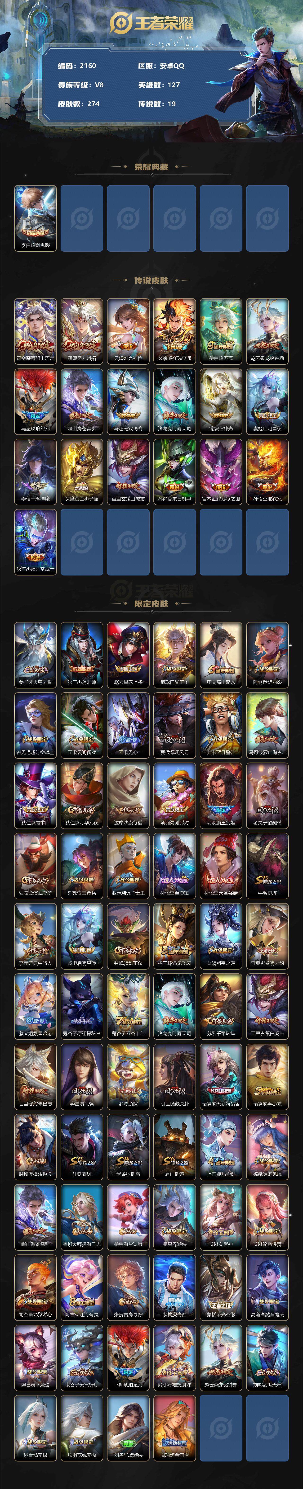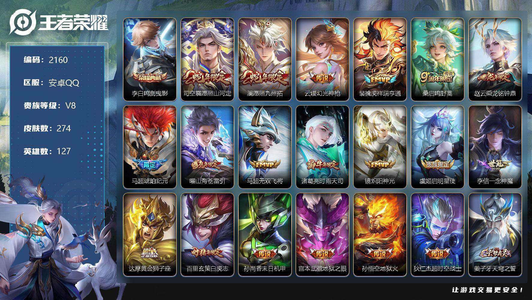 [13009256]安卓Q-V8-最强王者段位-127英雄-274皮肤-1典藏-0珍品无双-0无双-0珍品传说-19传说-79史诗 【英雄全皮】:孙权全皮,蒙恬全皮,司空震全皮,空空儿全皮 【荣耀典藏】:李白鸣剑曳影 【传说皮肤】:司空震愿照山河定,澜愿照九州拓,云缨幻光神枪,裴擒虎祥瑞亨通,桑启鸣野蒿,赵云乘龙铭钟鼎,马超琥珀纪元,曜山海苍雷引,马超无双飞将,诸葛亮时雨天司,镜炽阳神光,虞姬启明星使,李信一念神魔,达摩黄金狮子座,百里玄策白虎志,孙尚香末日机甲,宫本武藏地狱之眼,孙悟空地狱火,狄仁杰超时空战士 【限定皮肤】:姜子牙天穹之誓,狄仁杰阴阳师,赵云皇家上将,嬴政白昼王子,庄周高山流水,阿轲迷踪丽影,钟无艳超时空战士,元歌云间偶戏,元歌无心,夏侯惇朔风刀,典韦蓝屏警告,马可波罗山海玄木吟,狄仁杰魔术师,狄仁杰万华元夜,达摩沙漠行僧,项羽海滩派对,项羽霸王别姬,老夫子醍醐杖,程咬金演武夺筹,刘邦夺宝奇兵,亚瑟潮玩骑士王,孙悟空至尊宝,孙悟空大圣娶亲,牛魔御旌,李元芳云中旅人,虞姬启明星使,钟馗驱傩正仪,杨玉环遇见飞天,女娲朔望之晖,雅典娜黎明之约,蔡文姬繁星吟游,鬼谷子原初探秘者,鬼谷子五谷丰年,诸葛亮时雨天司,苏烈千军破阵,百里玄策白虎志,百里守约朱雀志,弈星混沌棋,梦奇顽趣,明世隐疑决卦,裴擒虎天狼狩猎者,裴擒虎李小龙,裴擒虎擒涛扼浪,狂铁御狮,米莱狄御霄,盾山御銮,上官婉儿梁祝,嫦娥暖冬兔眠,曜山海苍雷引,鲁班大师探海日志,桑启海盐诗旅,暃星界游侠,艾琳女武神,艾琳流音漫舞,司空震地狱燃心,阿古朵江河有灵,张良古海寻踪,裴擒虎梅西,蒙恬荣光圣徽,高渐离燃音魔法,妲己灵卜魔法,鬼谷子天穹祈灯,马超琥珀纪元,姬小满妄想食味,赵云乘龙铭钟鼎,刘邦剑破天穹,镜青焰无极,项羽苍威无极,刘备异域游侠,周瑜熔金海岸 【年限皮肤】:百里玄策白虎志,百里守约朱雀志,诸葛亮时雨天司,马可波罗山海玄木吟,曜山海苍雷引,赵云乘龙铭钟鼎 【赛季限定】:夏侯惇朔风刀,狄仁杰万华元夜,达摩沙漠行僧,老夫子醍醐杖,程咬金演武夺筹,张良古海寻踪,牛魔御旌,李元芳云中旅人,钟馗驱傩正仪,雅典娜黎明之约,鬼谷子原初探秘者,苏烈千军破阵,弈星混沌棋,梦奇顽趣,明世隐疑决卦,裴擒虎擒涛扼浪,狂铁御狮,米莱狄御霄,盾山御銮,鲁班大师探海日志,桑启海盐诗旅,鬼谷子天穹祈灯,蒙恬荣光圣徽,刘邦剑破天穹,姜子牙天穹之誓