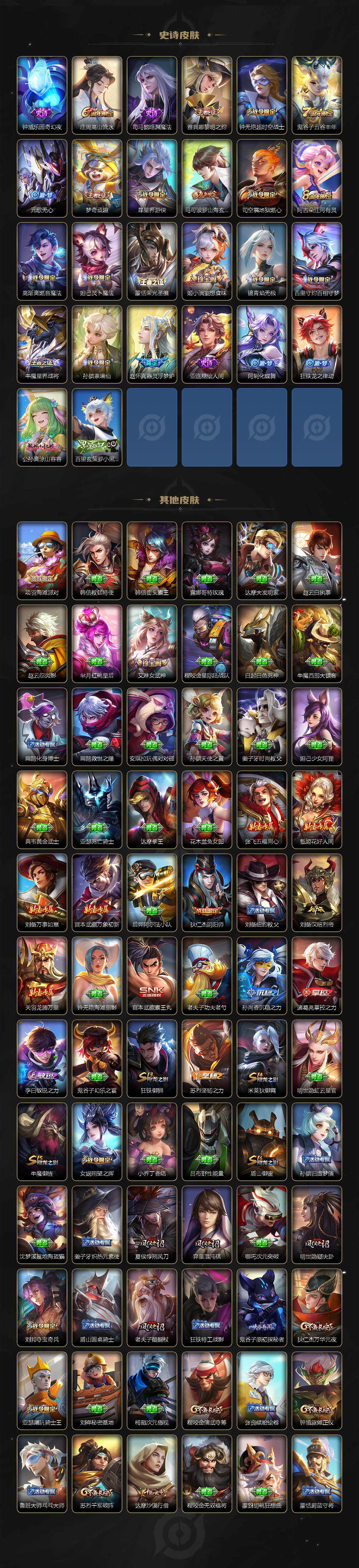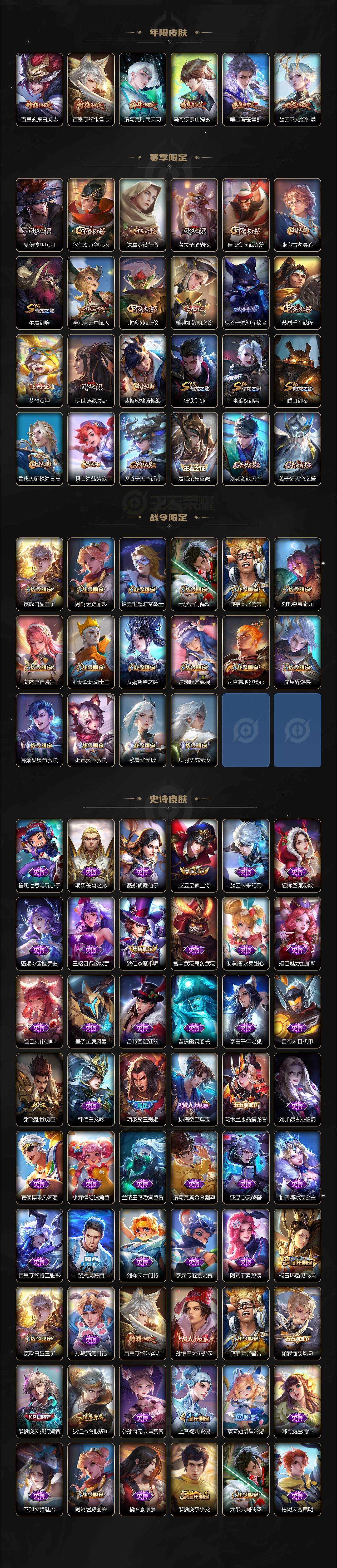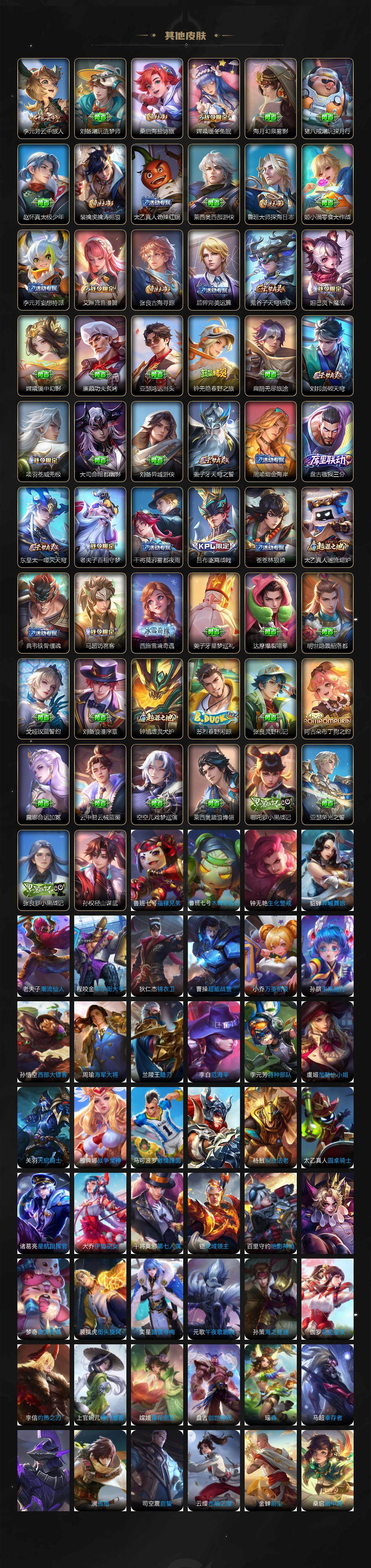 【限定皮肤】:姜子牙天穹之誓,狄仁杰阴阳师,赵云皇家上将,嬴政白昼王子,庄周高山流水,阿轲迷踪丽影,钟无艳超时空战士,元歌云间偶戏,元歌无心,夏侯惇朔风刀,典韦蓝屏警告,马可波罗山海玄木吟,狄仁杰魔术师,狄仁杰万华元夜,达摩沙漠行僧,项羽海滩派对,项羽霸王别姬,老夫子醍醐杖,程咬金演武夺筹,刘邦夺宝奇兵,亚瑟潮玩骑士王,孙悟空至尊宝,孙悟空大圣娶亲,牛魔御旌,李元芳云中旅人,虞姬启明星使,钟馗驱傩正仪,杨玉环遇见飞天,女娲朔望之晖,雅典娜黎明之约,蔡文姬繁星吟游,鬼谷子原初探秘者,鬼谷子五谷丰年,诸葛亮时雨天司,苏烈千军破阵,百里玄策白虎志,百里守约朱雀志,弈星混沌棋,梦奇顽趣,明世隐疑决卦,裴擒虎天狼狩猎者,裴擒虎李小龙,裴擒虎擒涛扼浪,狂铁御狮,米莱狄御霄,盾山御銮,上官婉儿梁祝,嫦娥暖冬兔眠,曜山海苍雷引,鲁班大师探海日志,桑启海盐诗旅,暃星界游侠,艾琳女武神,艾琳流音漫舞,司空震地狱燃心,阿古朵江河有灵,张良古海寻踪,裴擒虎梅西,蒙恬荣光圣徽,高渐离燃音魔法,妲己灵卜魔法,鬼谷子天穹祈灯,马超琥珀纪元,姬小满妄想食味,赵云乘龙铭钟鼎,刘邦剑破天穹,镜青焰无极,项羽苍威无极,刘备异域游侠,周瑜熔金海岸