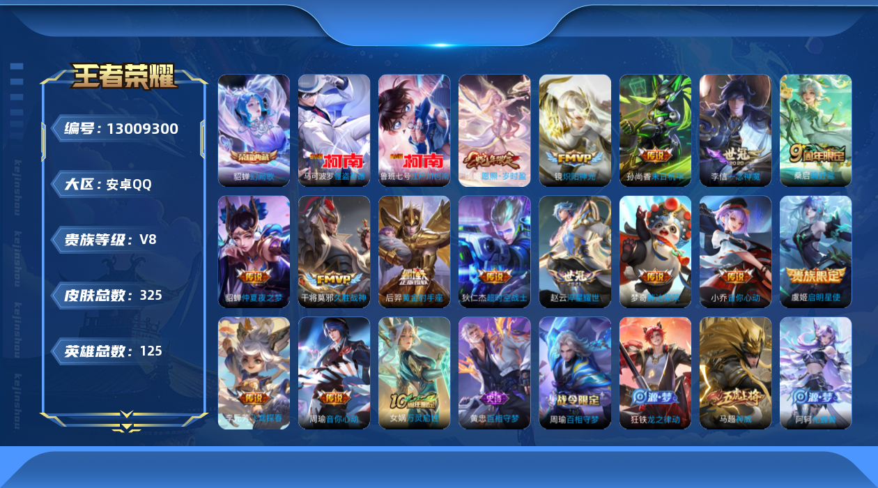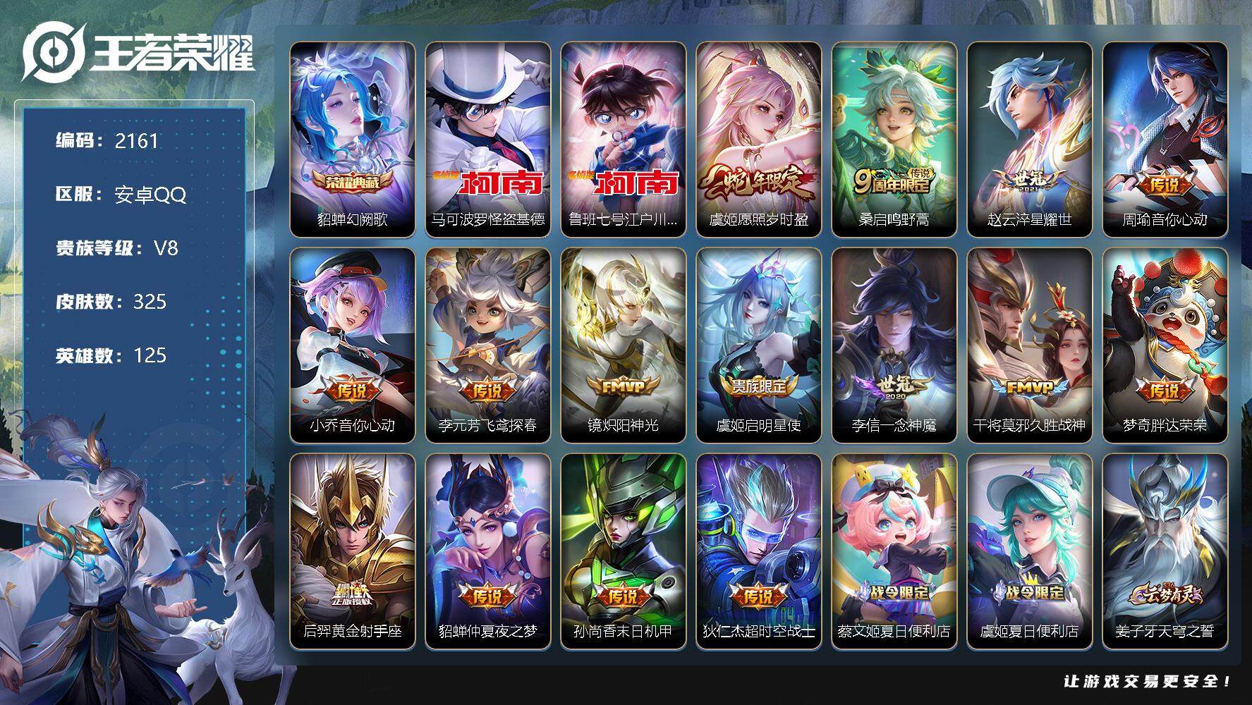 [13009300]安卓Q-V8-至尊星耀IV段位-125英雄-325皮肤-1典藏-0珍品无双-0无双-2珍品传说-15传说-87史诗 【英雄全皮】:鬼谷子全皮,蒙恬全皮,戈娅全皮,影全皮 【荣耀典藏】:貂蝉幻阙歌 【珍品传说】:马可波罗怪盗基德,鲁班七号江户川柯南 【传说皮肤】:虞姬愿照岁时盈,桑启鸣野蒿,赵云淬星耀世,周瑜音你心动,小乔音你心动,李元芳飞鸢探春,镜炽阳神光,虞姬启明星使,李信一念神魔,干将莫邪久胜战神,梦奇胖达荣荣,后羿黄金射手座,貂蝉仲夏夜之梦,孙尚香末日机甲,狄仁杰超时空战士 【限定皮肤】:蔡文姬夏日便利店,虞姬夏日便利店,姜子牙天穹之誓,狄仁杰阴阳师,虞姬凯尔特女王,赵云皇家上将,孙尚香蔷薇恋人,高渐离死亡摇滚,扁鹊炼金王,芈月重明,夏侯惇朔风刀,曹操烛龙,狄仁杰魔术师,狄仁杰万华元夜,达摩沙漠行僧,项羽海滩派对,老夫子醍醐杖,安琪拉魔法小厨娘,程咬金演武夺筹,兰陵王金庭之子,牛魔御旌,后羿辉光之辰,李元芳银河之约,李元芳云中旅人,虞姬启明星使,钟馗驱傩正仪,女娲朔望之晖,雅典娜黎明之约,东皇太一逐梦之光,鬼谷子原初探秘者,鬼谷子五谷丰年,苏烈千军破阵,弈星混沌棋,梦奇顽趣,沈梦溪星空之诺,沈梦溪大漠名商,明世隐疑决卦,裴擒虎擒涛扼浪,狂铁御狮,云中君纤云弄巧,盾山御銮,上官婉儿梁祝,嫦娥拒霜思,西施玲珑珍味,鲁班大师探海日志,桑启海盐诗旅,戈娅驭风魔法,阿古朵江河有灵,张良古海寻踪,蒙犽百解令,蒙恬荣光圣徽,高渐离燃音魔法,妲己灵卜魔法,鬼谷子天穹祈灯,姬小满妄想食味,沈梦溪龙舞盛年,鲁班七号蔬乡物语,李元芳蔬乡物语,刘邦剑破天穹,程咬金群星魔术团,镜青焰无极,项羽苍威无极,刘备异域游侠,周瑜熔金海岸 【年限皮肤】:后羿辉光之辰,马超神威 【赛季限定】:扁鹊炼金王,芈月重明,夏侯惇朔风刀,曹操烛龙,狄仁杰万华元夜,达摩沙漠行僧,老夫子醍醐杖,程咬金演武夺筹,兰陵王金庭之子,张良古海寻踪,牛魔御旌,李元芳云中旅人,虞姬凯尔特女王,钟馗驱傩正仪,雅典娜黎明之约,鬼谷子原初探秘者,苏烈千军破阵,弈星混沌棋,梦奇顽趣,沈梦溪大漠名商,明世隐疑决卦,裴擒虎擒涛扼浪,狂铁御狮,盾山御銮,鲁班大师探海日志,桑启海盐诗旅,鬼谷子天穹祈灯,蒙恬荣光圣徽,刘邦剑破天穹,姜子牙天穹之誓 【战令限定】:蔡文姬夏日便利店,虞姬夏日便利店,李元芳银河之约,女娲朔望之晖,沈梦溪星空之诺